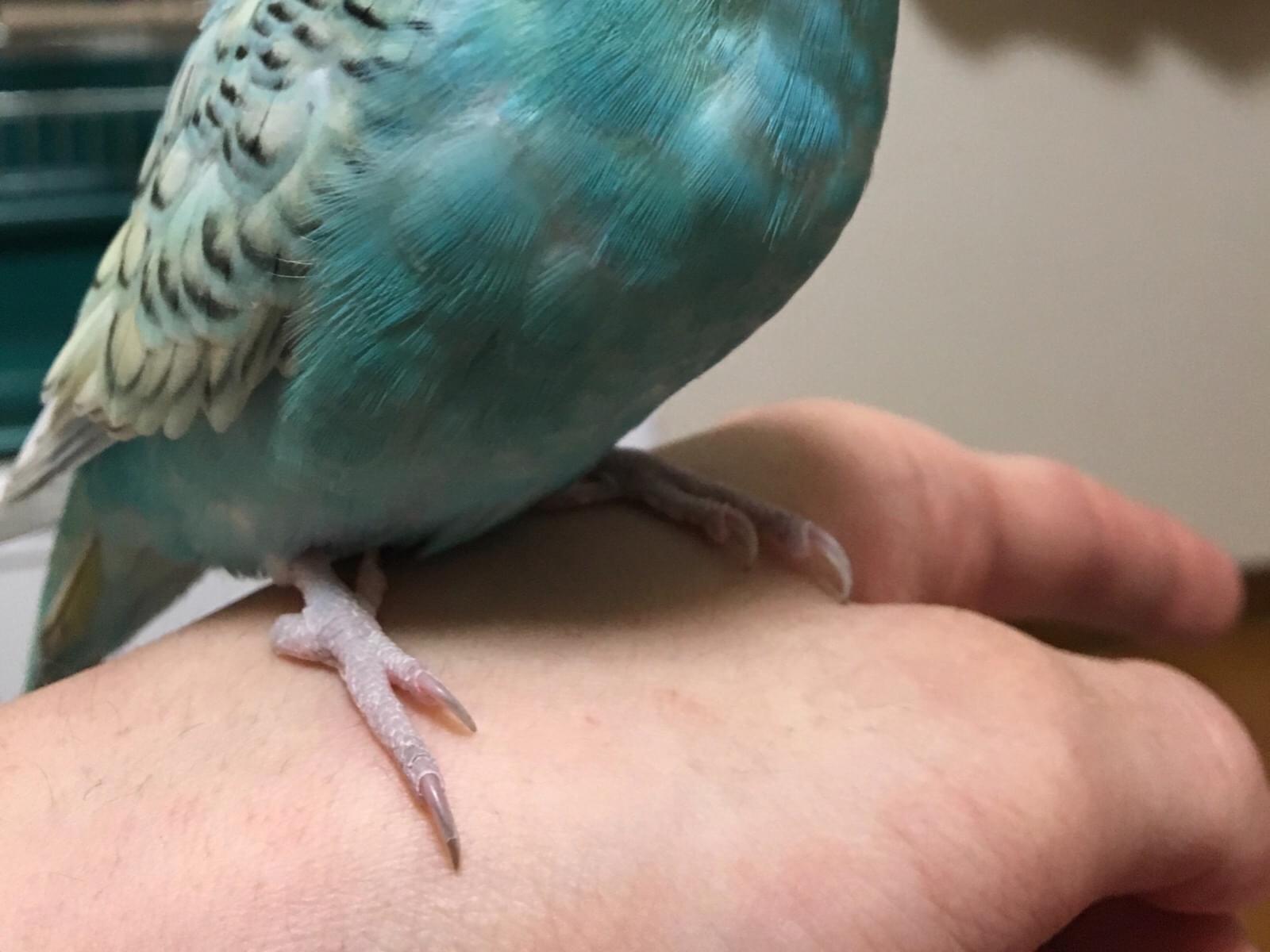 特徴は頭は薄黄色、体がエメラルドグリーン、頬が紫色、チークパッチがグレー、鼻が茶色のセキセイインコです。右足の指が一本無いです。