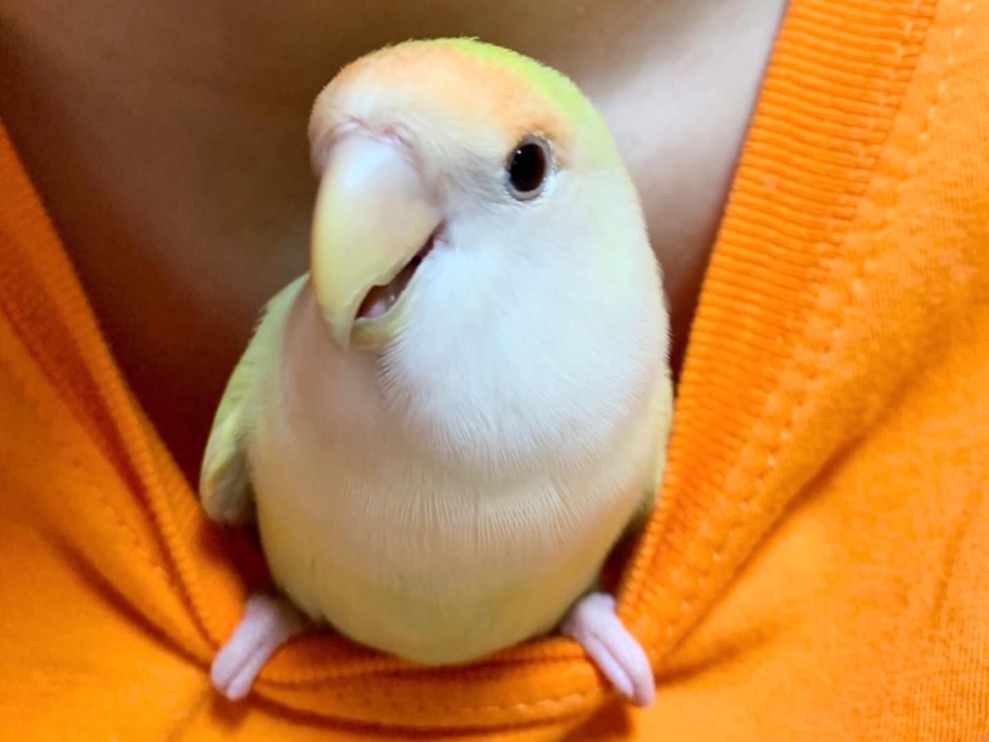色:写真の通り黄色ベースで頭の部分がオレンジです。尾羽が青と緑です。