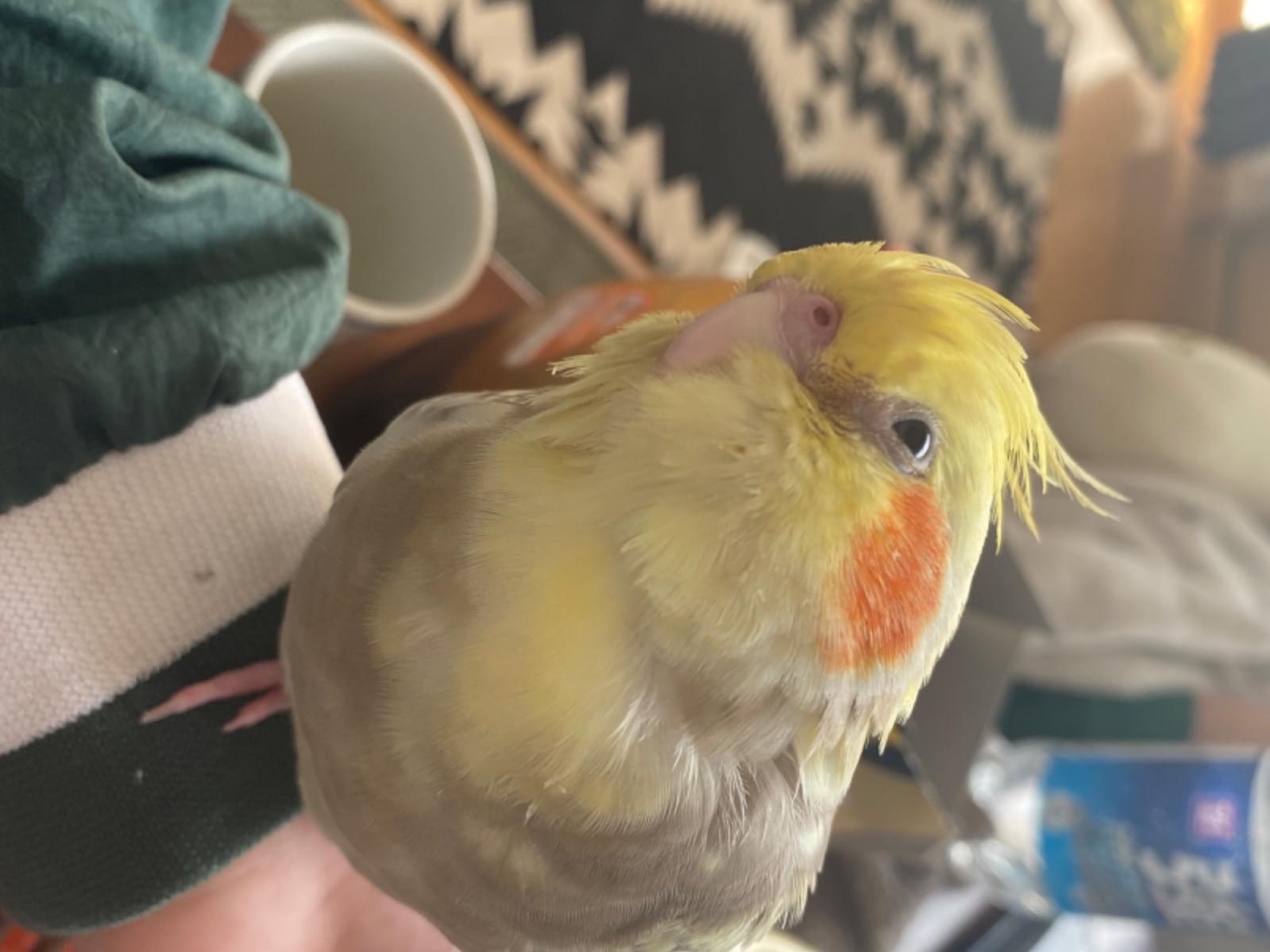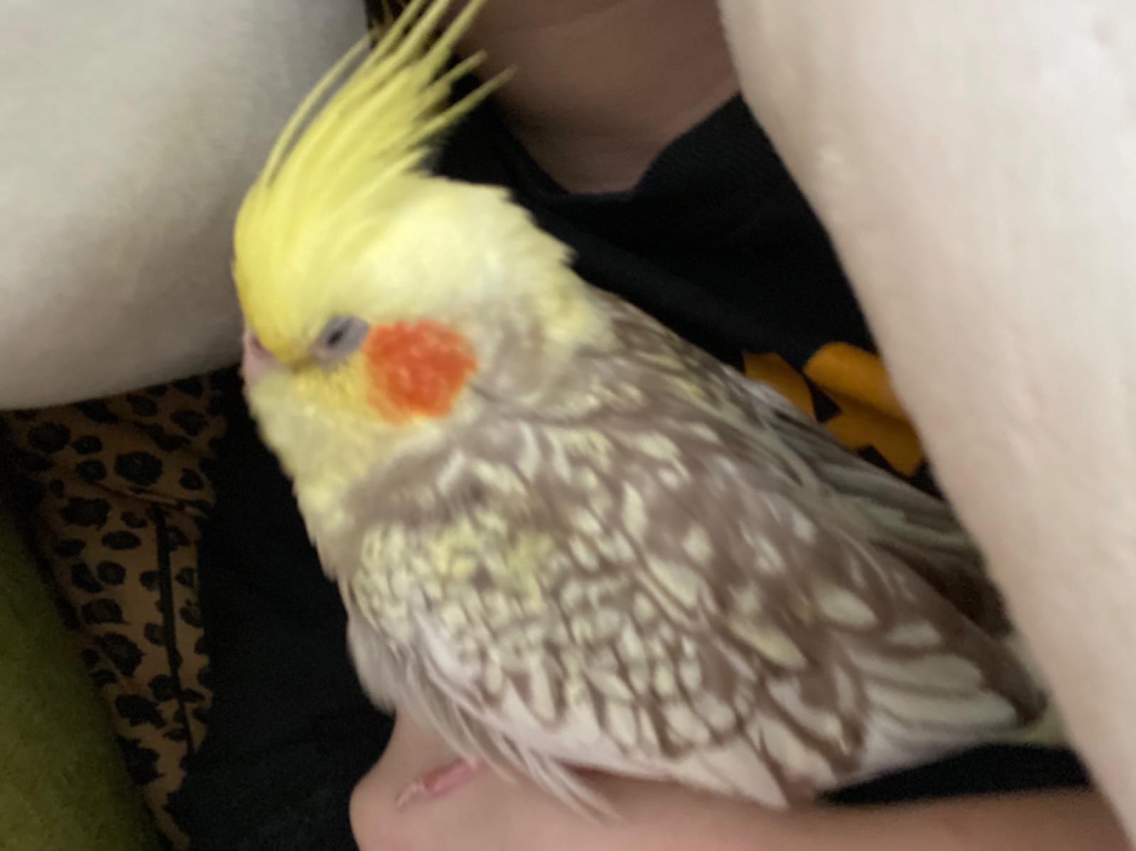黄色とグレーが主体の色で羽根のところに模様があります。オレンジのほっぺです。