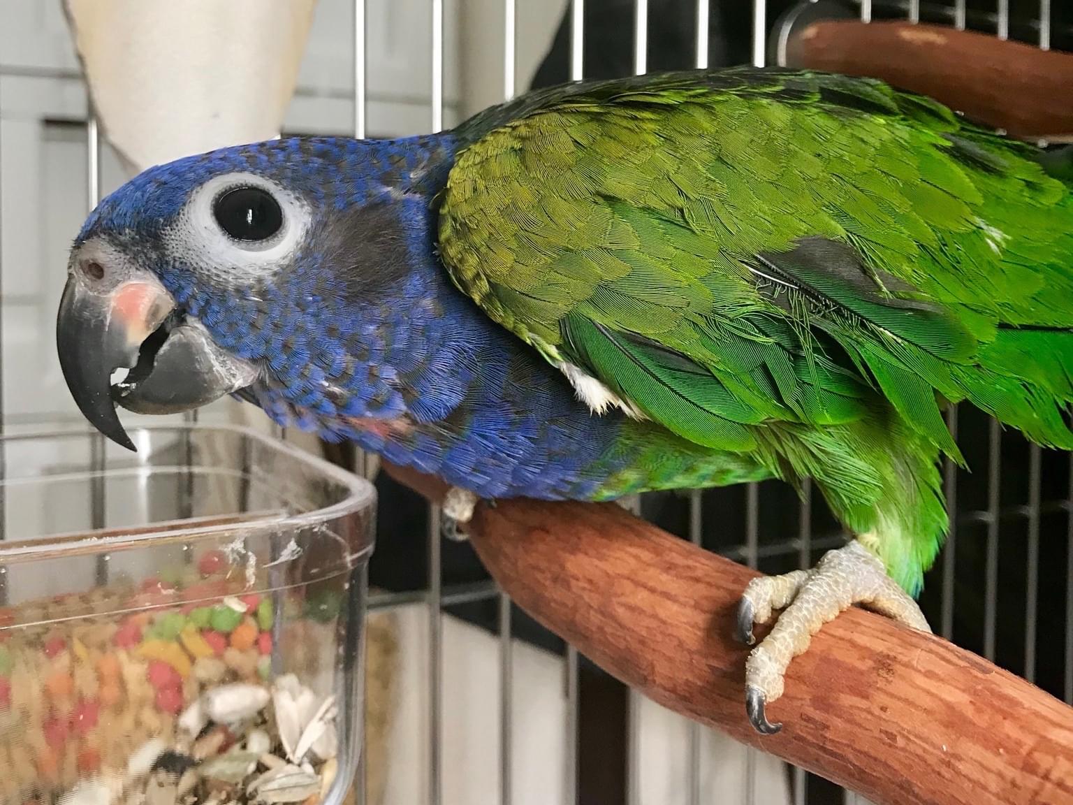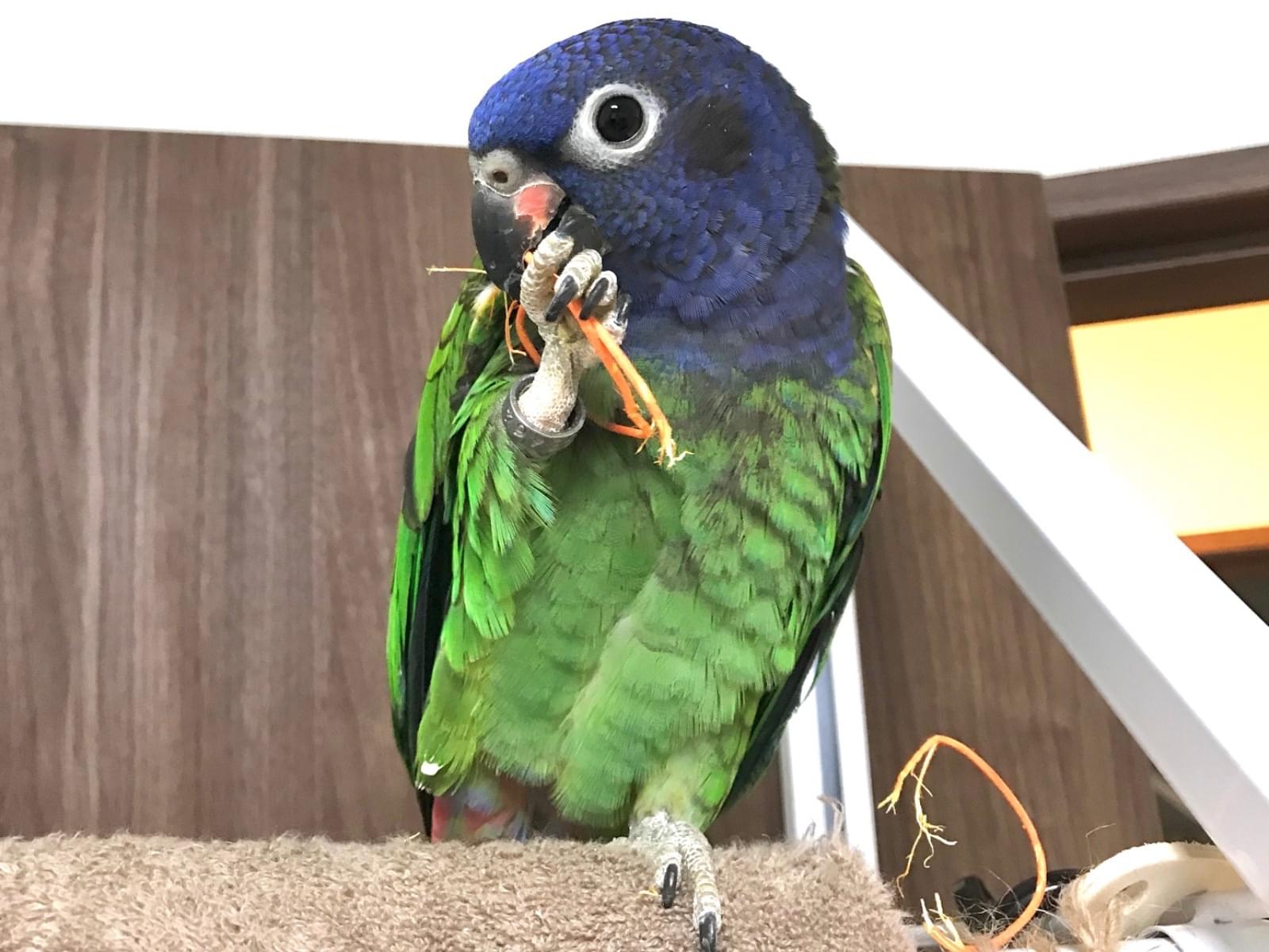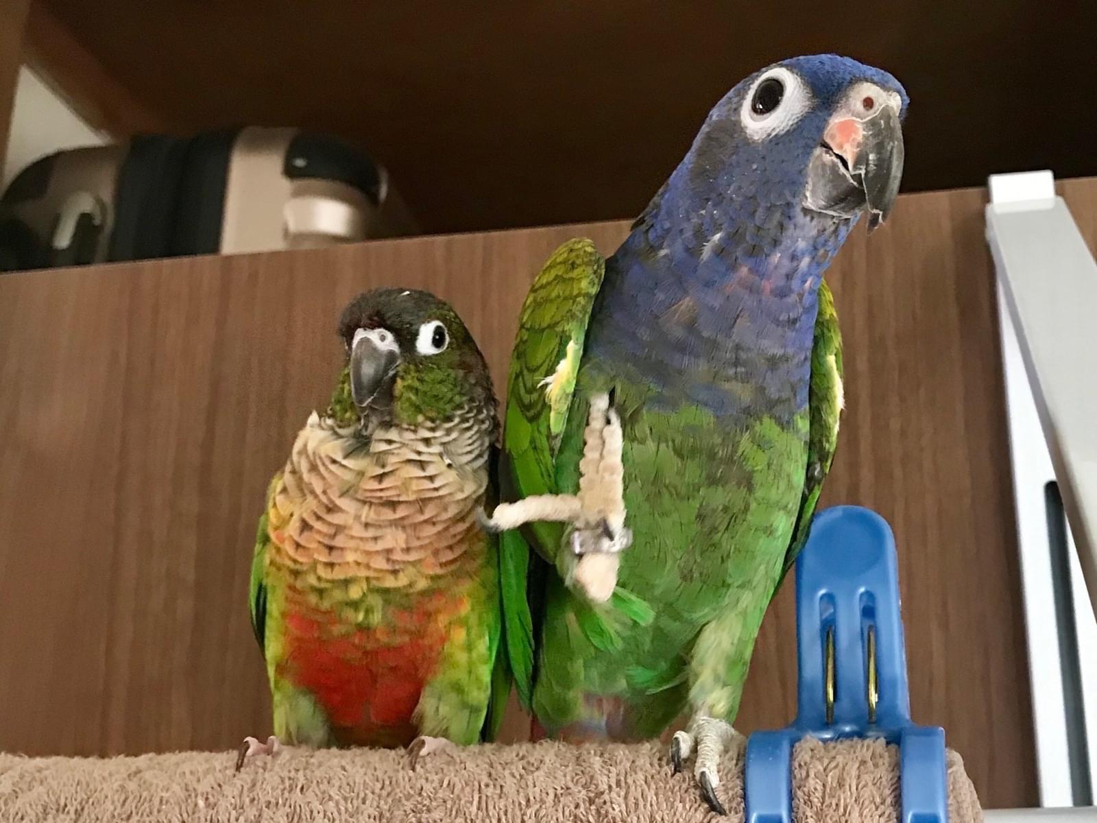 行動:長距離を飛ぶことが苦手で、基本的にその場でじっと動かないことが多いです。地面を歩くこともあります。隙間や穴が大好きで、入り込んでいる可能性も高いです。好きな食べ物は、バナナ、みかん、シード、ペレットなど。一応手乗りで好きな人の頭や肩に止まります。