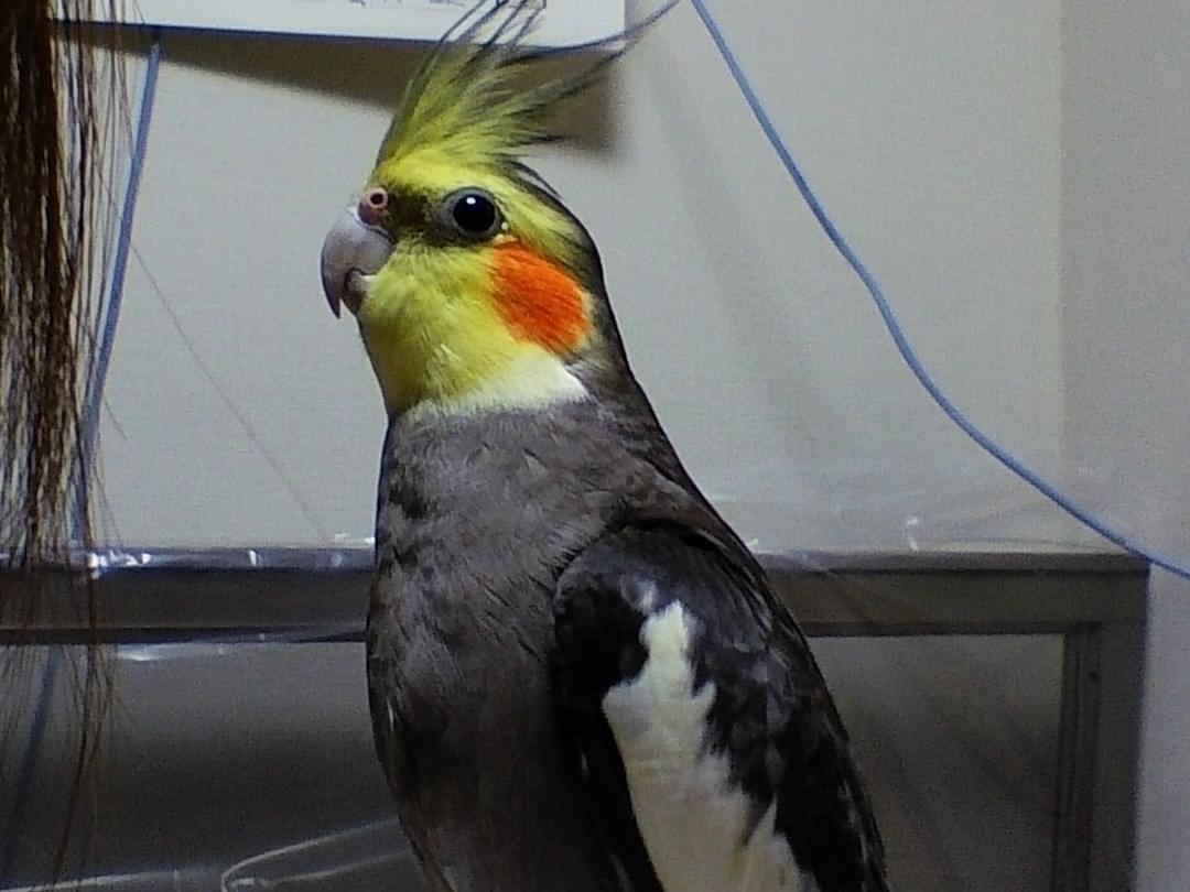 とさかがグレーで顔は黄色ほっぺは赤いノーマルのオカメインコです。ハナちゃんと呼ぶとハナちゃんと返してきます。
