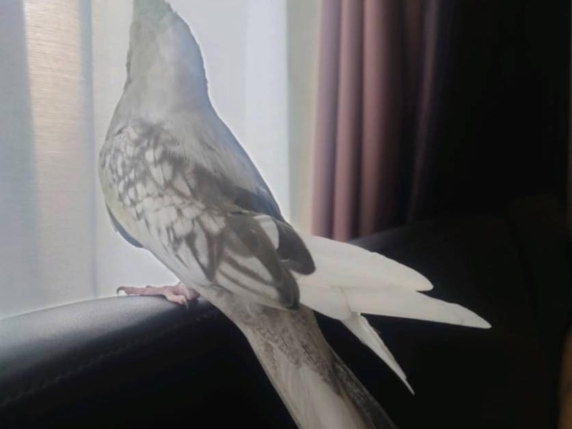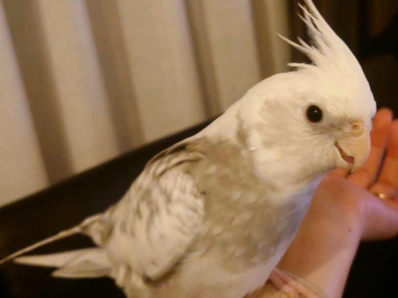 白とグレー(ホワイトフェイスパールパイド)のオカメインコです。手乗りで育てたので人馴れしてます。生後8ヶ月ですが見た目は大人です。