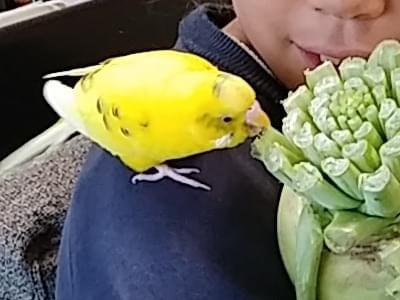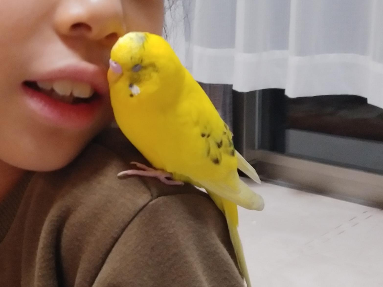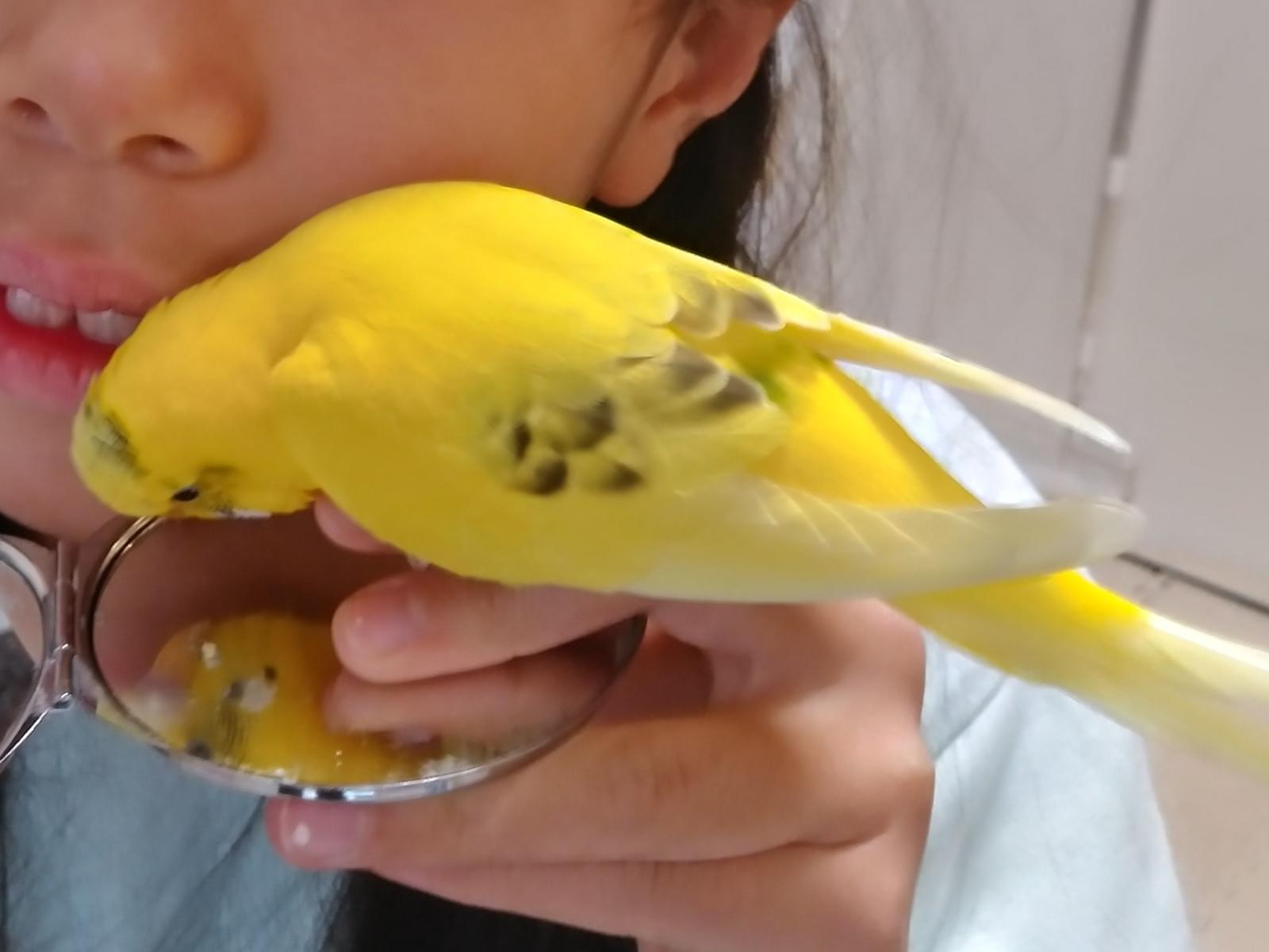 全体が黄色で黒の斑点があり、お腹の辺りが緑です。しっぽの羽が抜けてしまっているので、今は短いです。