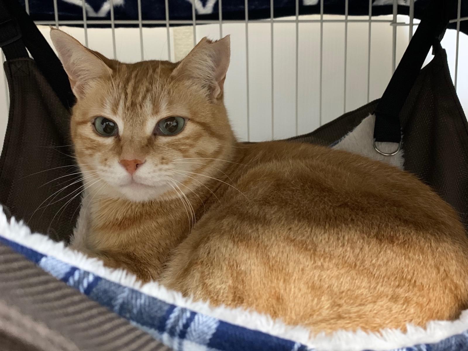 丸顔で緑色の瞳をした茶トラです。