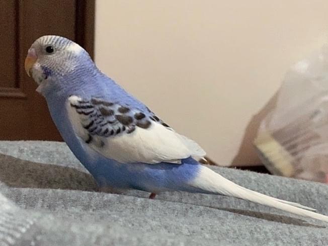 白と水色の混合色、頬は濃いめの青、黒い模様あり、しっぽは白く長い、内側の羽が少しカット済み