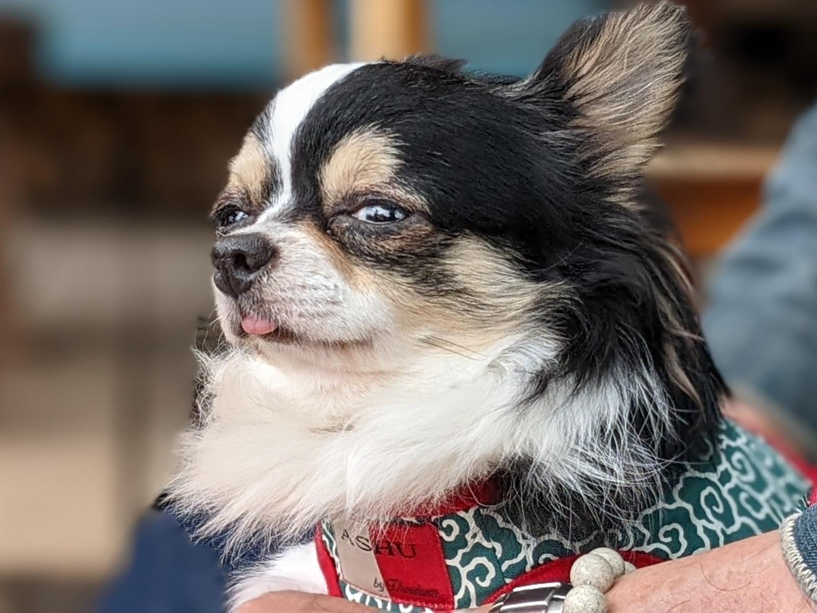 吠えず噛まずとても大人しい性格です。どことなく泣きそうな顔をしています。黒と白に少し茶色の毛が混じった毛色。黒い尻尾の先が白くなっています。爪は全て黒。去勢はしていません。マイクロチップ無し。