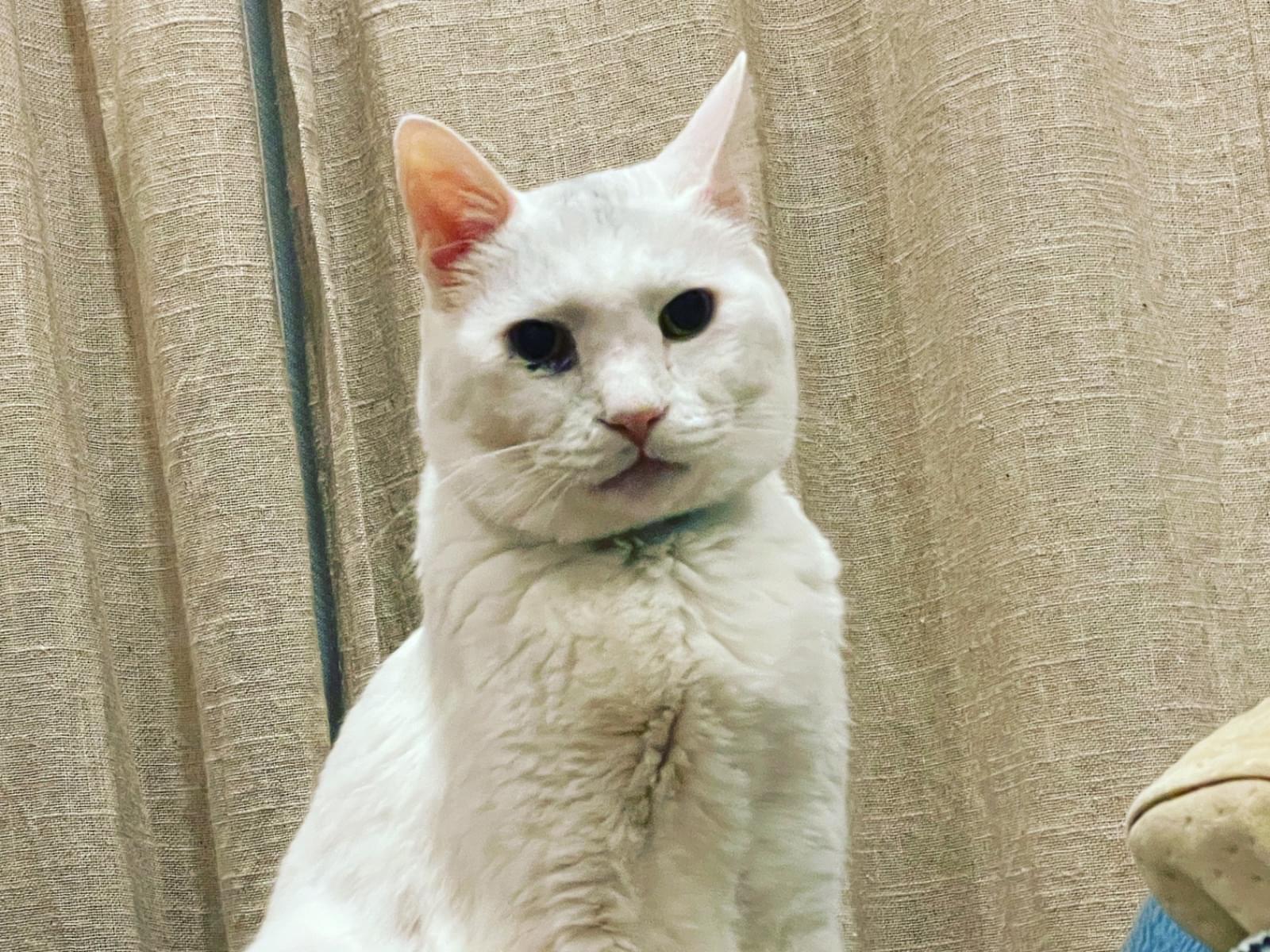 青い首輪をした白い猫を探しています