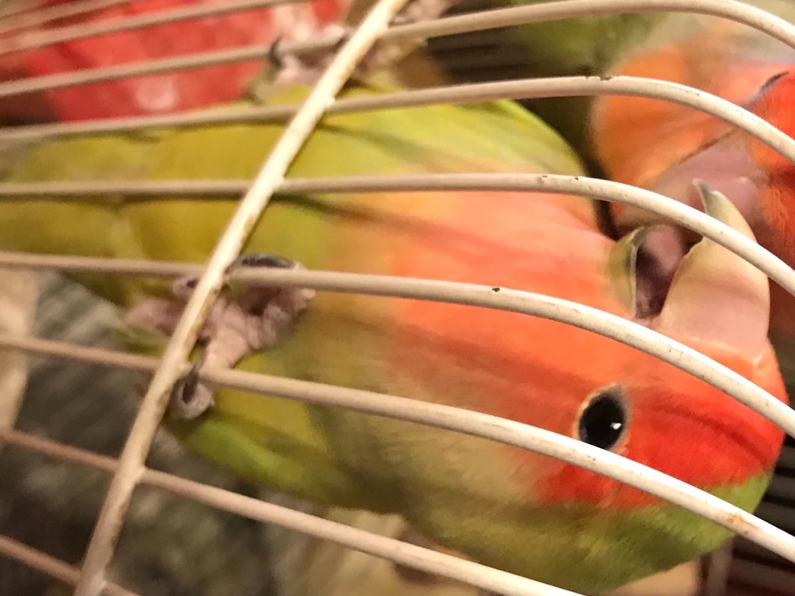 顔は赤みの強いオレンジ、お腹は黄緑色で、背中は薄い抹茶色です。