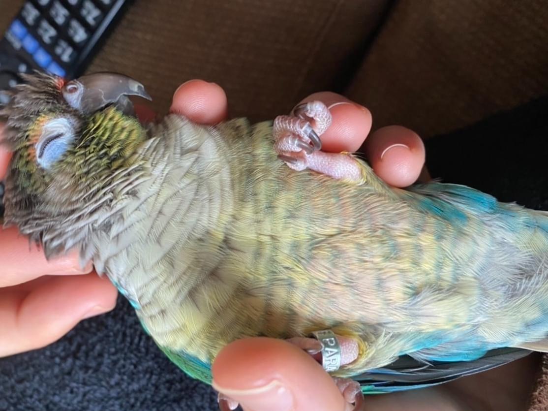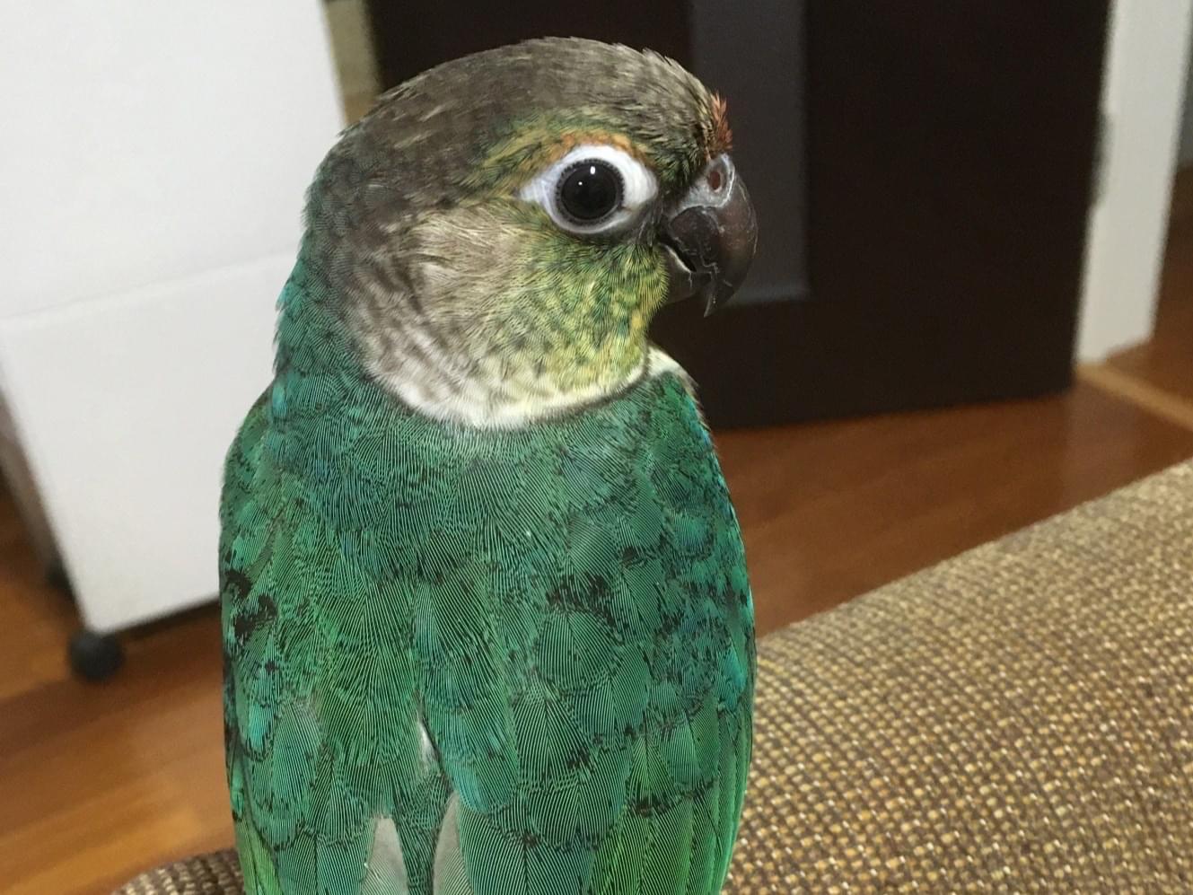 背中は深緑色、お腹は薄黄色、風切羽には青が混じっています。銀色の足輪をしています。肩や頭に止まります。しゃがれ声でボソッと喋ることがあります。