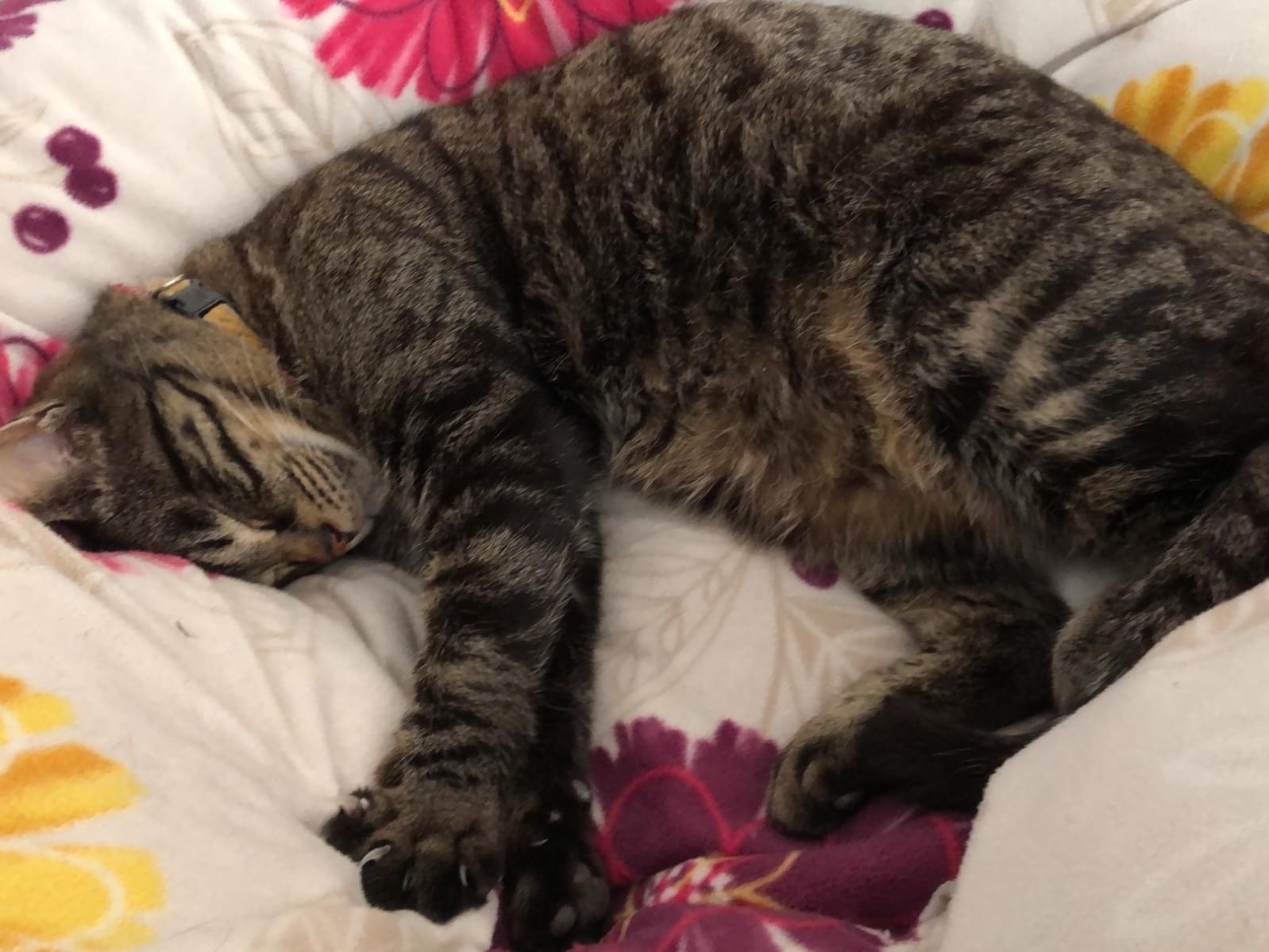 赤い三角形のスカーフを首輪に縫い付けています。その下にTILEを付けています。