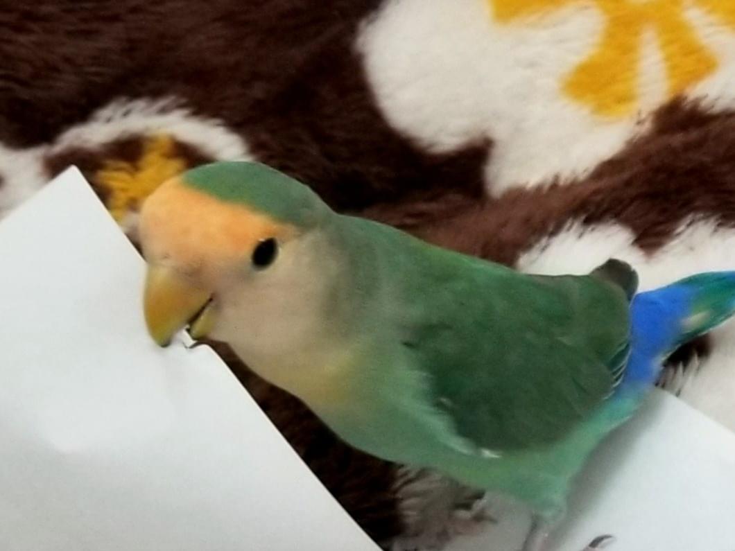 額がオレンジ、顔は白、体が緑のコザクラインコを探しています!!