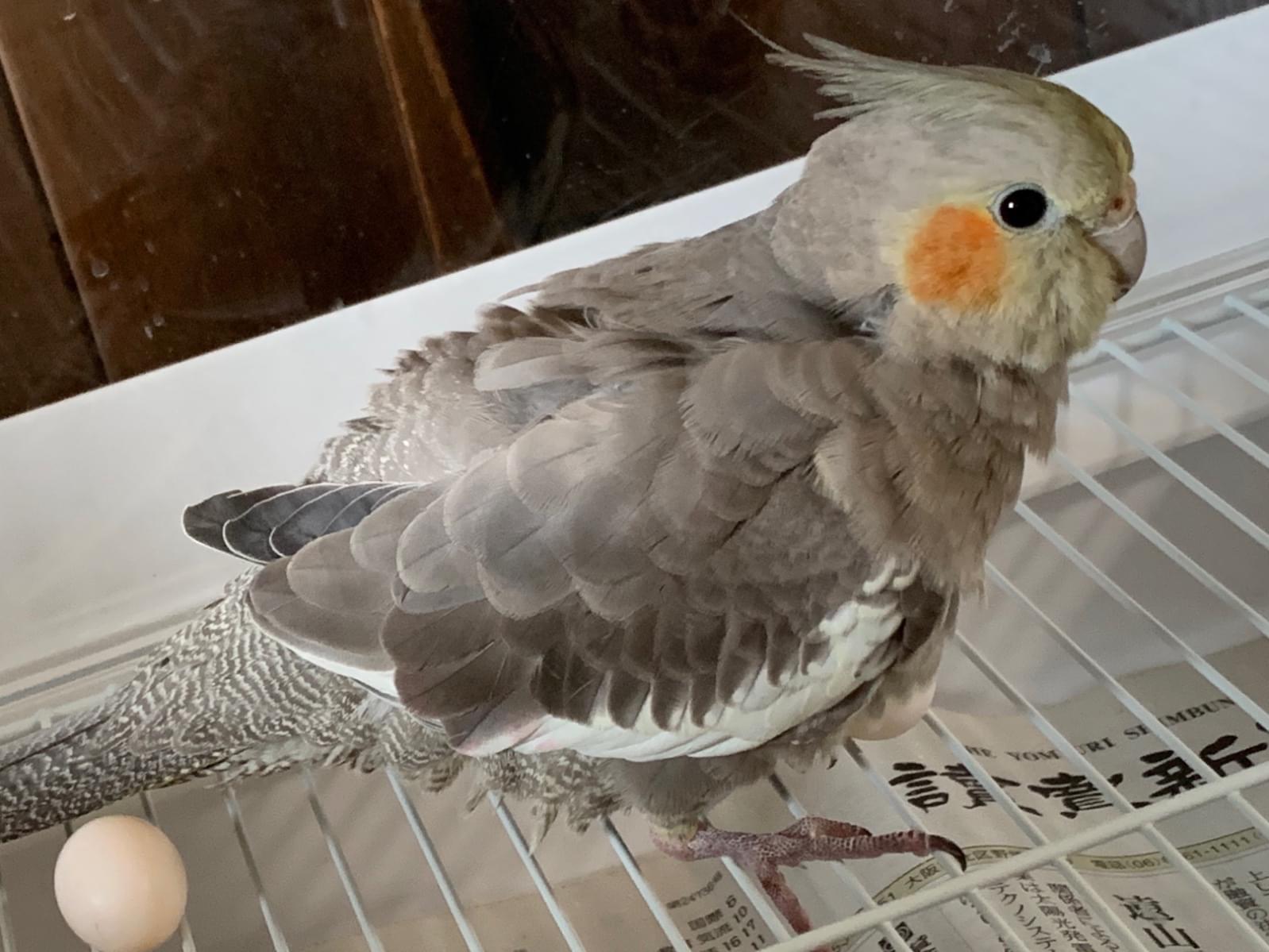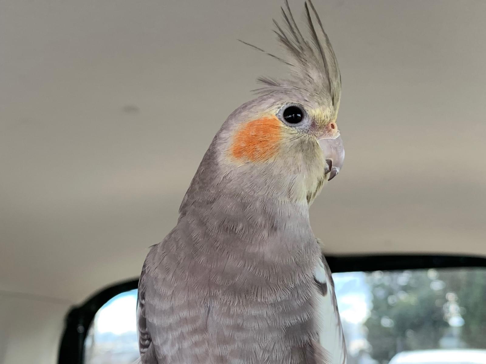 全体的にグレーで羽根の下の方が白、ほっぺがオレンジ色のオカメインコです。ほっぺの周りに黄色が少し混じった女の子でお喋りはしません。10時前、マンションのベランダから飛んでいきました。