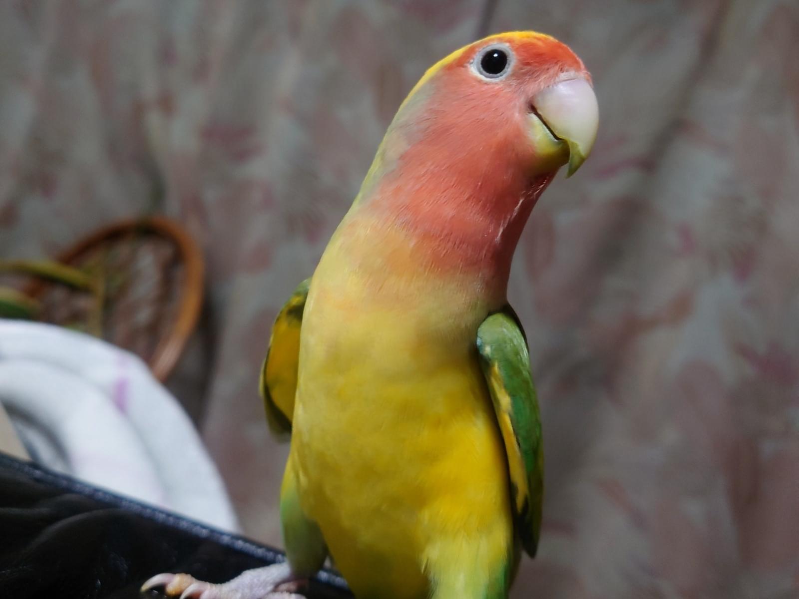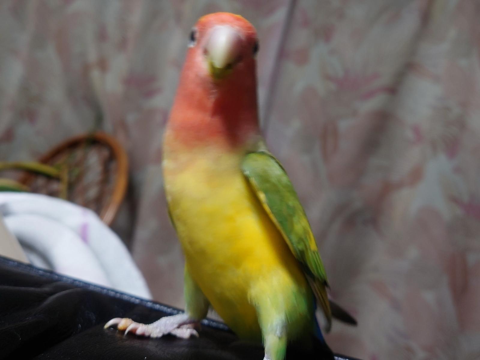 顔が赤、お腹が黄色、羽根が緑、尾羽根が青のコザクラインコを探しています。