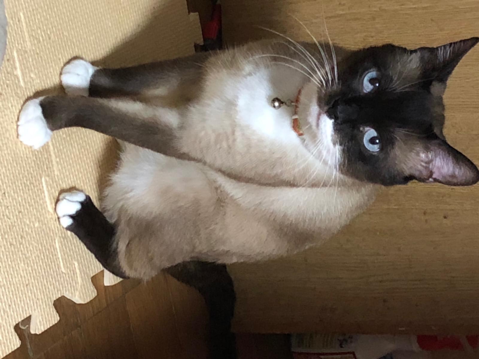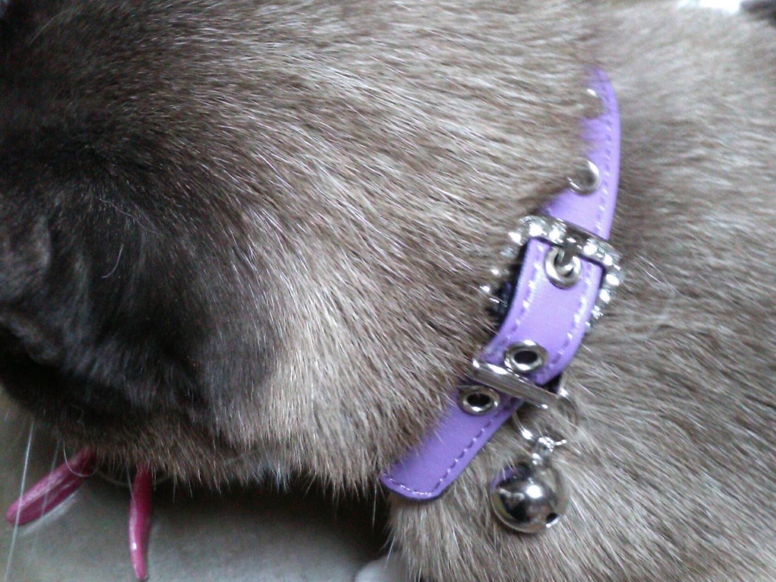 全足先が白、左口上に白、新しい紫色の鈴付き首輪をしています。