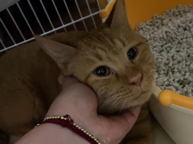 白地の赤と青のラインの蝶結び(赤い鈴)の首輪をつけています。人見知りはしないがちょっと臆病な性格。