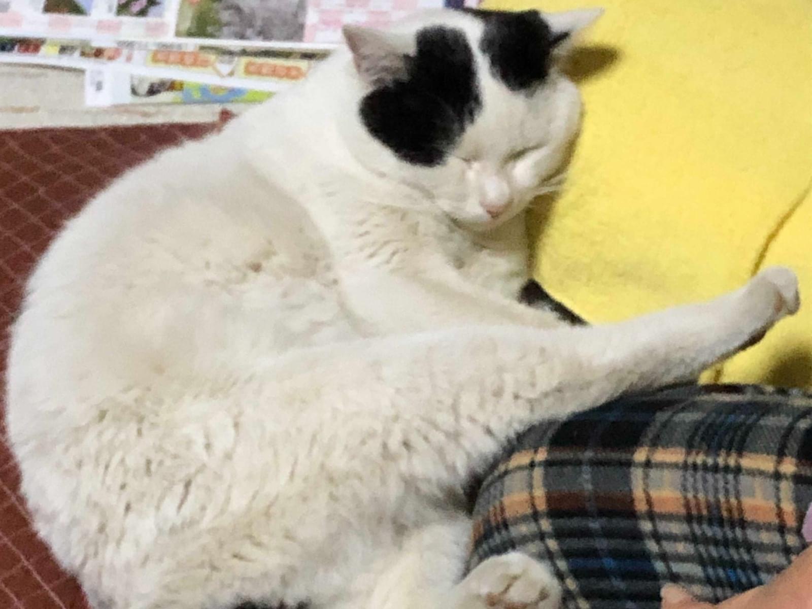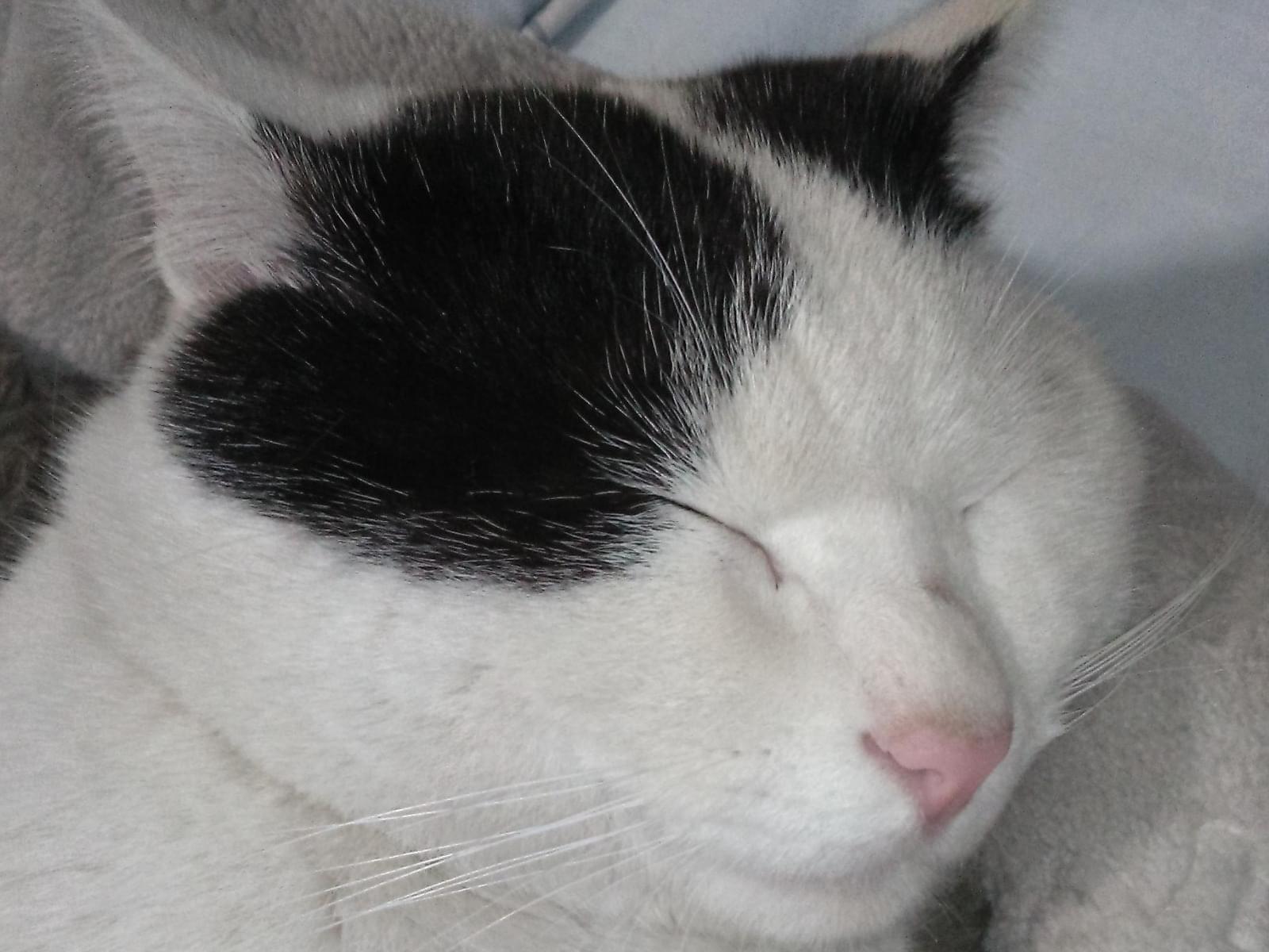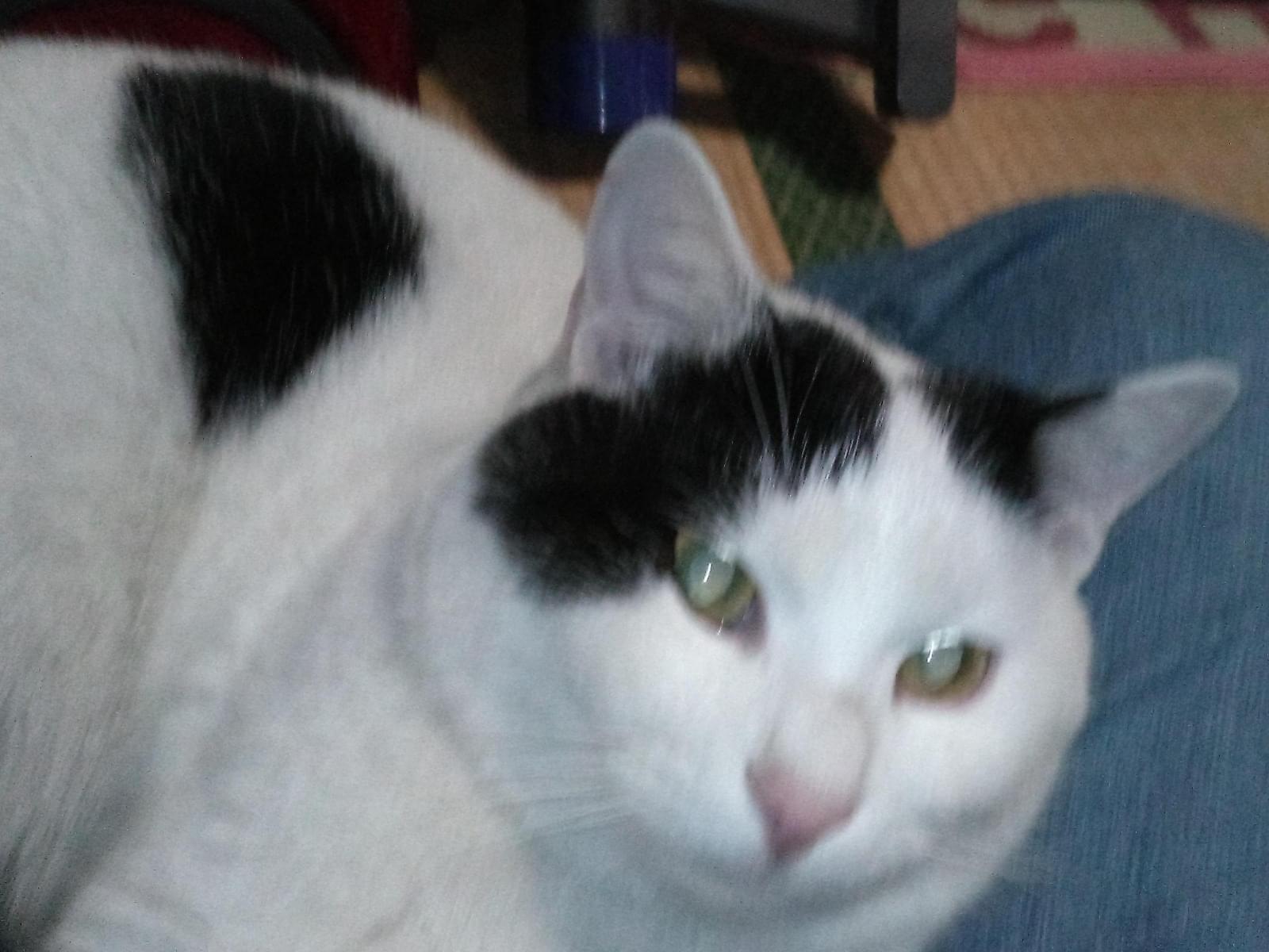 体毛は白黒で全体的に白の割合が多く、頭と背中に黒いブチがあります。黒く短い尻尾(ウサギのような毛玉状です)が特徴。生後1年程ですが、年齢の割にやや太り気味で重いです(体重4キロ)。