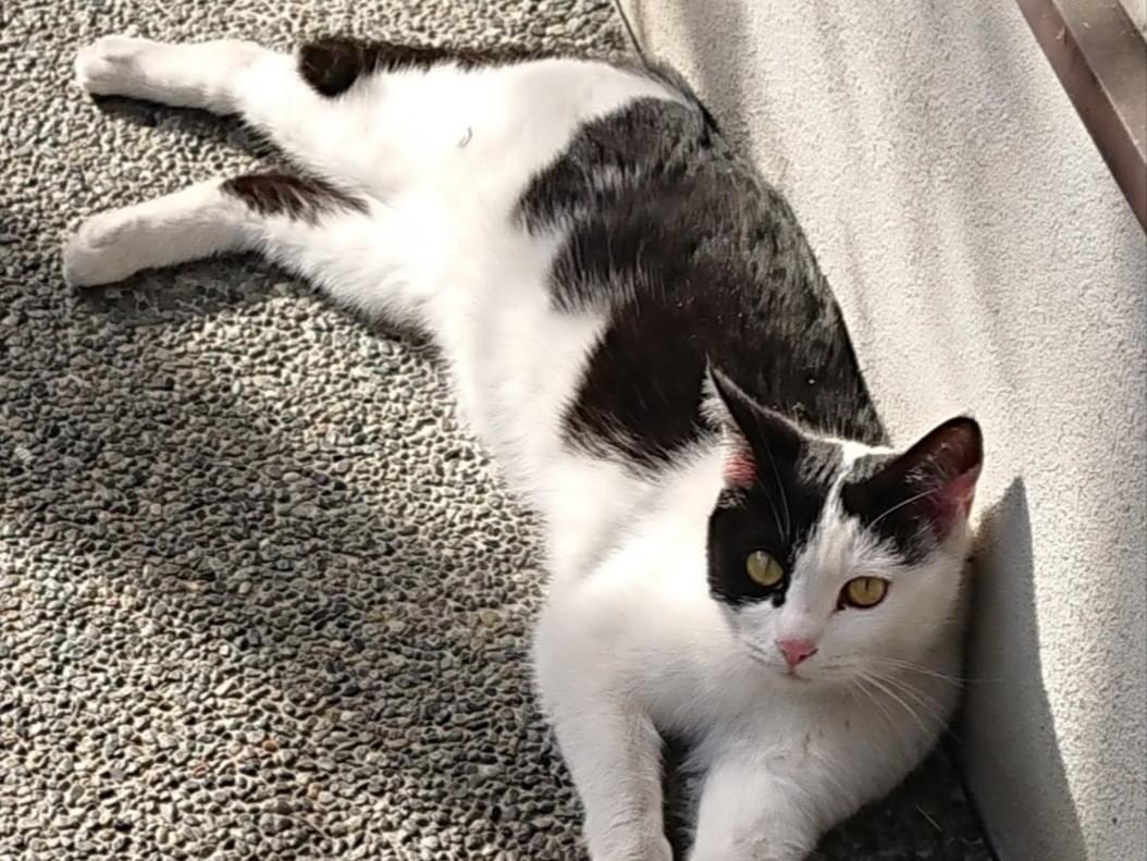 防府市で迷子になりました、右耳がカットされているシロクロ猫です