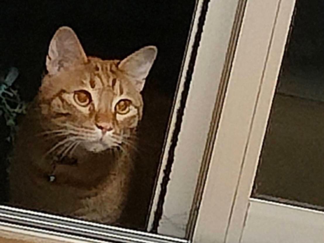 2022年4月24日の夜に、庭に首輪つきの茶トラが長い間座って家の中をずっと見ていました。水色の首輪に鈴がついていて、魚の模様の首輪でした。