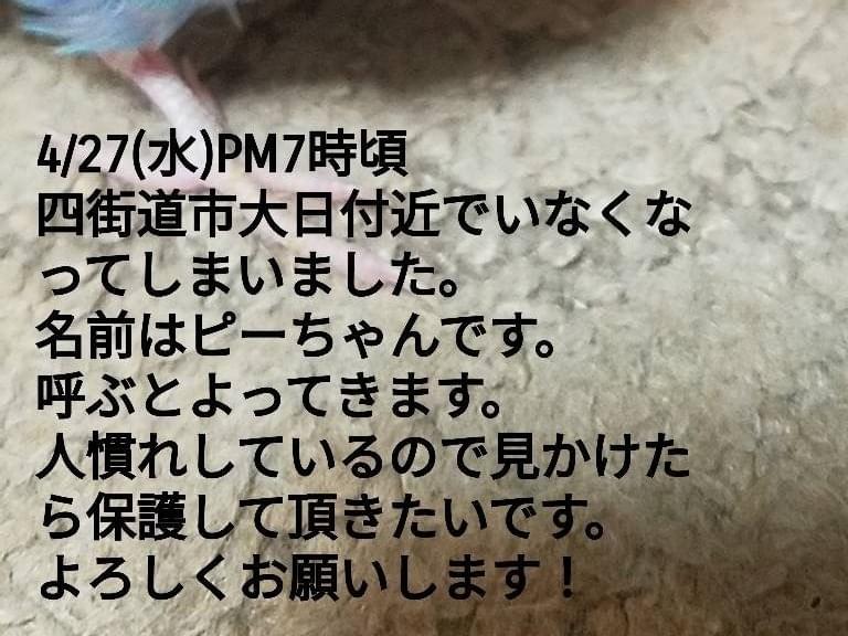 ホーム迷子鳥千葉県水色のセキセイインコ…水色のセキセイインコ探しています管理編集するポスター掲載終了最終更新日時:2022/04/29 00:26写真情報用件迷子名前ぴーちゃん性別メス年齢不明場所千葉県 四街道市発生日時2022年4月27日(水)飼い主れん説明ピーちゃんと自分の名前を言えます。人になれていてピーちゃんと呼べばきます。連絡先URL未設定掲示板情報交換のための掲示板です。ユーザーからの情報提供、オーナーからの連絡などにご利用下さいませ。まだコメントはありません。トピックを作成する