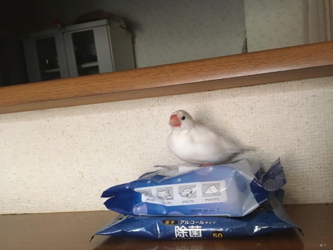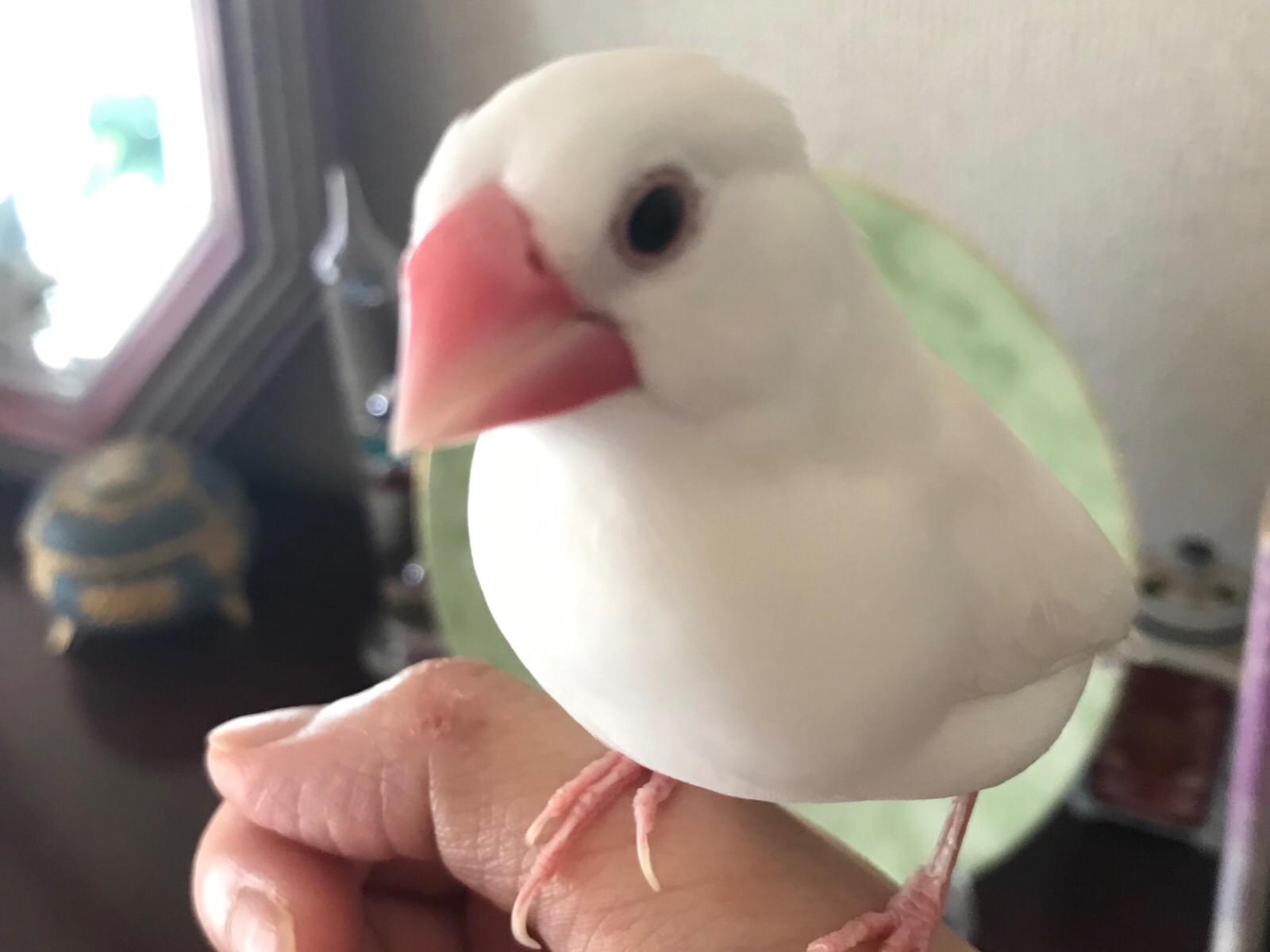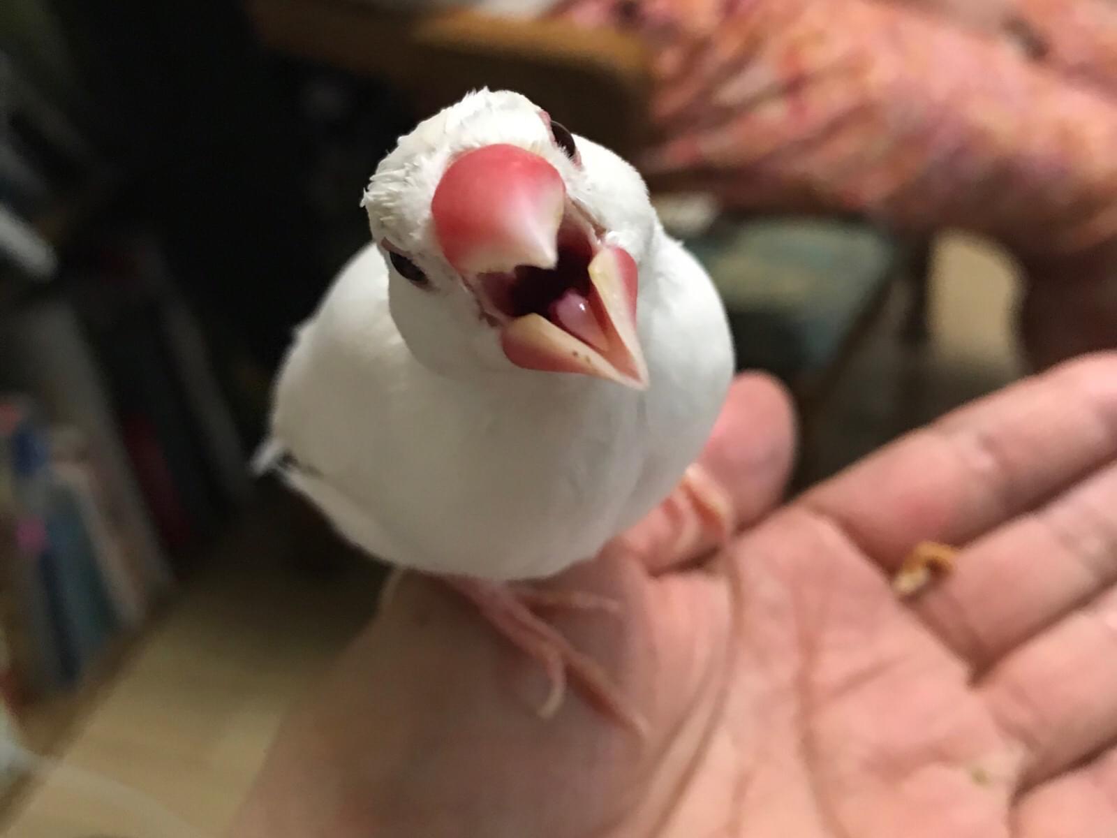 くちばしが赤い白い手のひらサイズの文鳥