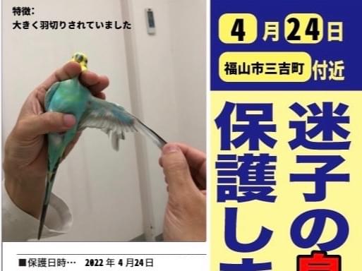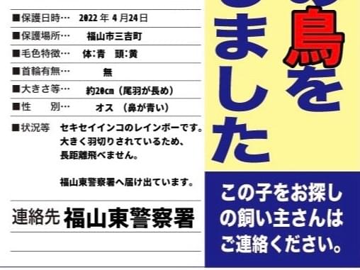 【4/24】福山市三吉町で青色(頭:黄色)のセキセイインコ(種類:レインボー)を保護しました
