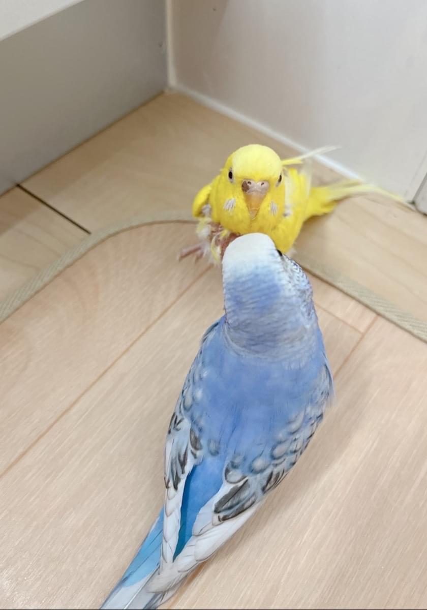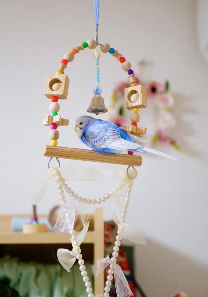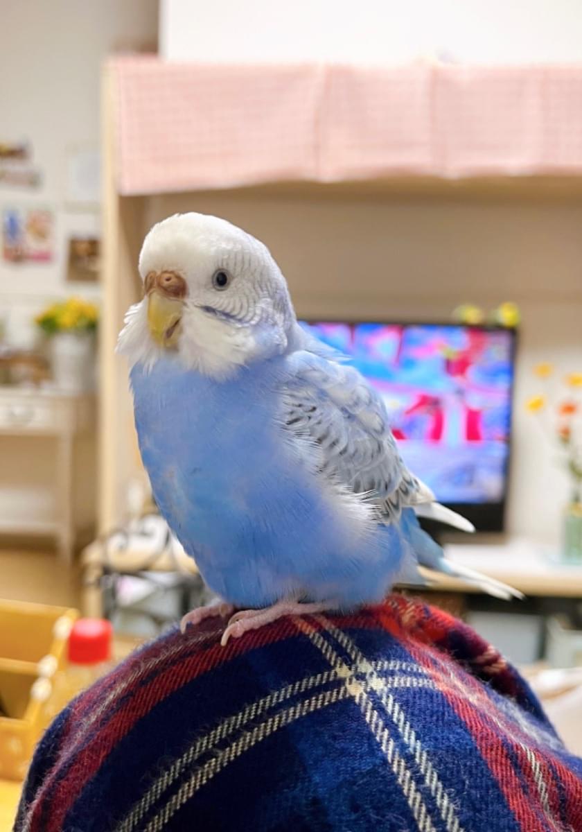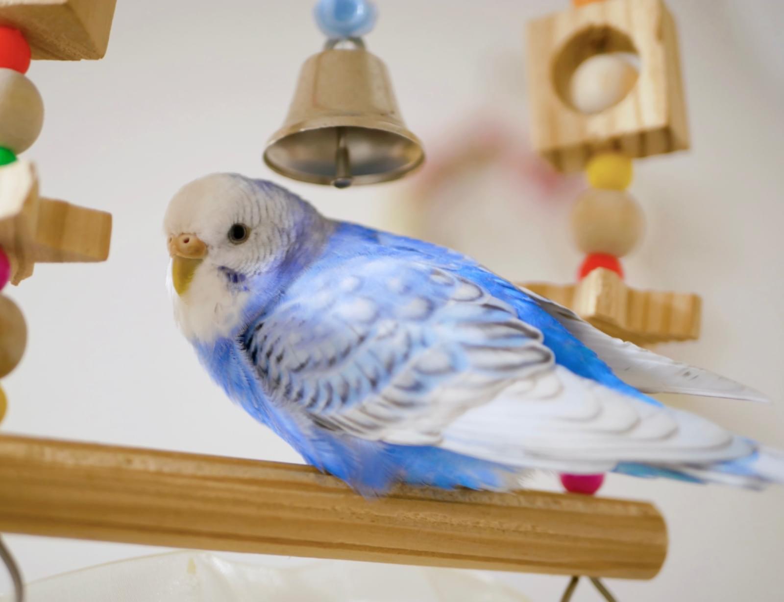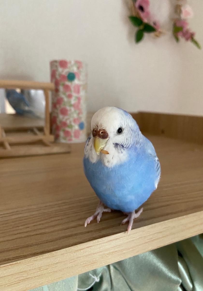スパングル系の品種で、明るい水色です。背中に黒の模様が入っています。ろう膜は濃い茶色です。