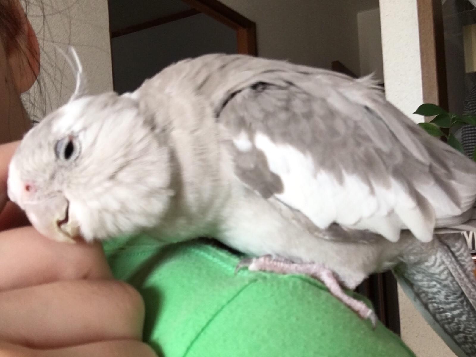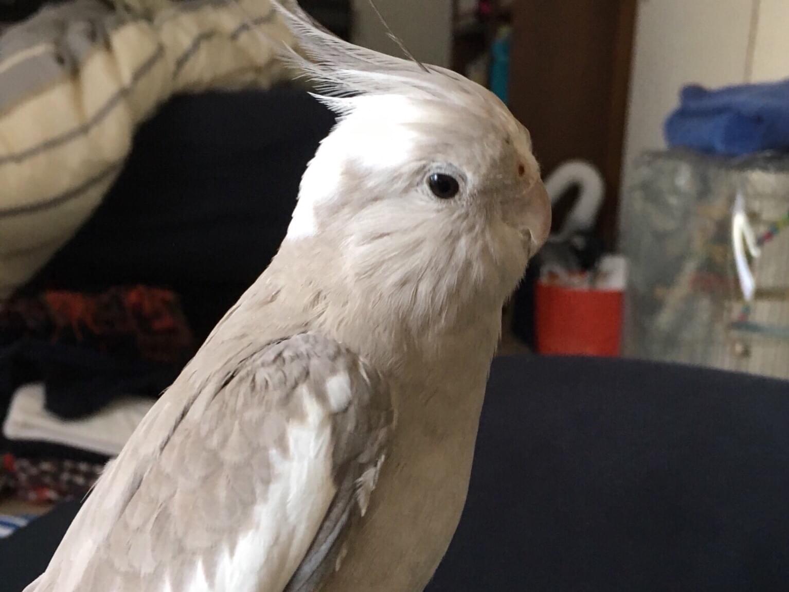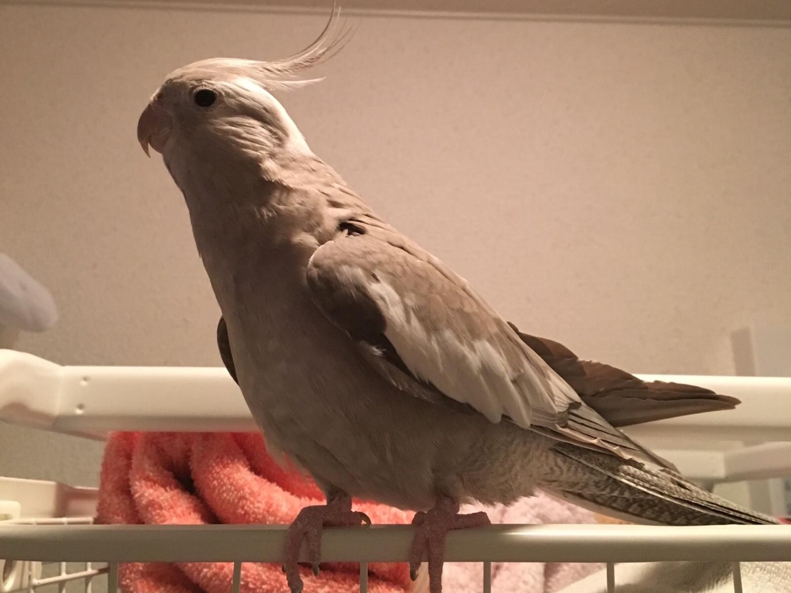オカメインコのホワイトフェイスで、全体的にグレー色、頭の一部と羽の端が白色です。