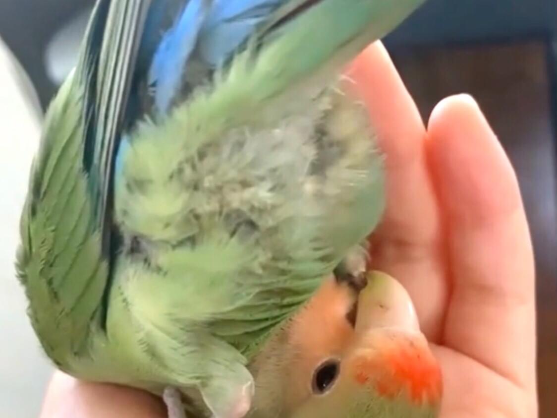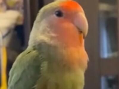 4/24の早朝、コザクラインコノーマル(全体がウグイス色、顔まわりがオレンジ、はね、尾羽に青が入っています。)の「るり」が空いていた窓から出てしまったようです。