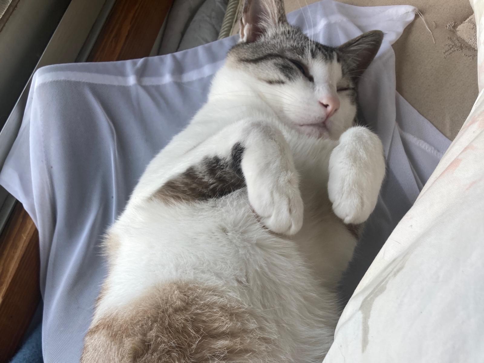 3才のオスで少し大きめ、背中は茶色でお腹は真っ白です。