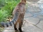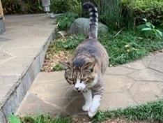 サバトラのオス猫、鈴のついたグレーの首輪を付けています。