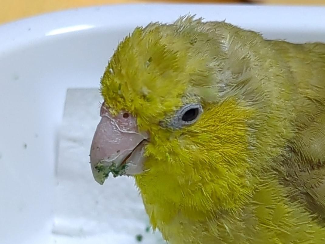 色はくすんだ黄緑色です。抹茶色といってもいいかもしれません。くちばしはインコの形をしていますが、大きさは文鳥と同じくらいで、尾羽根もインコにしては短いです。
