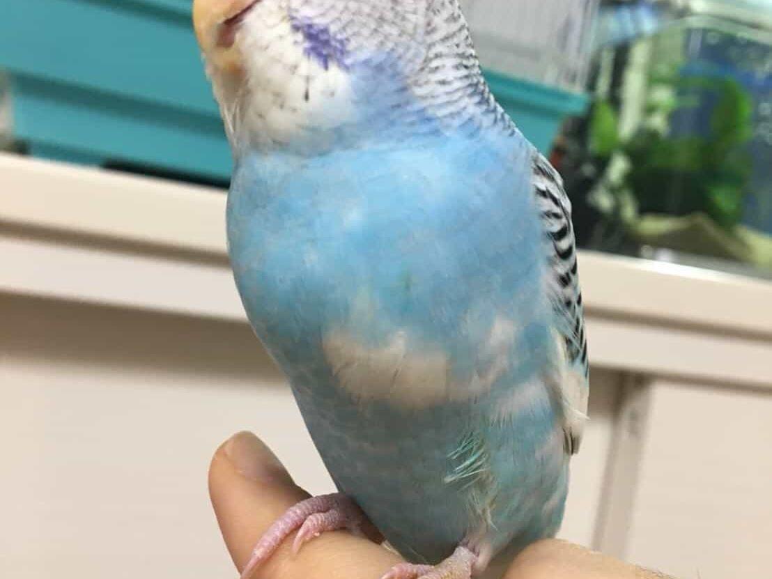 そらちゃん:白い顔と翼でお腹と背中は水色。黒のまだら模様が入っています。ほっぺは青色。