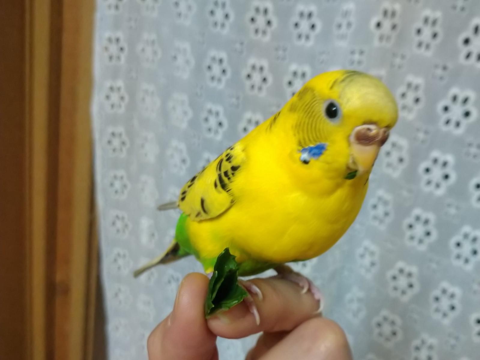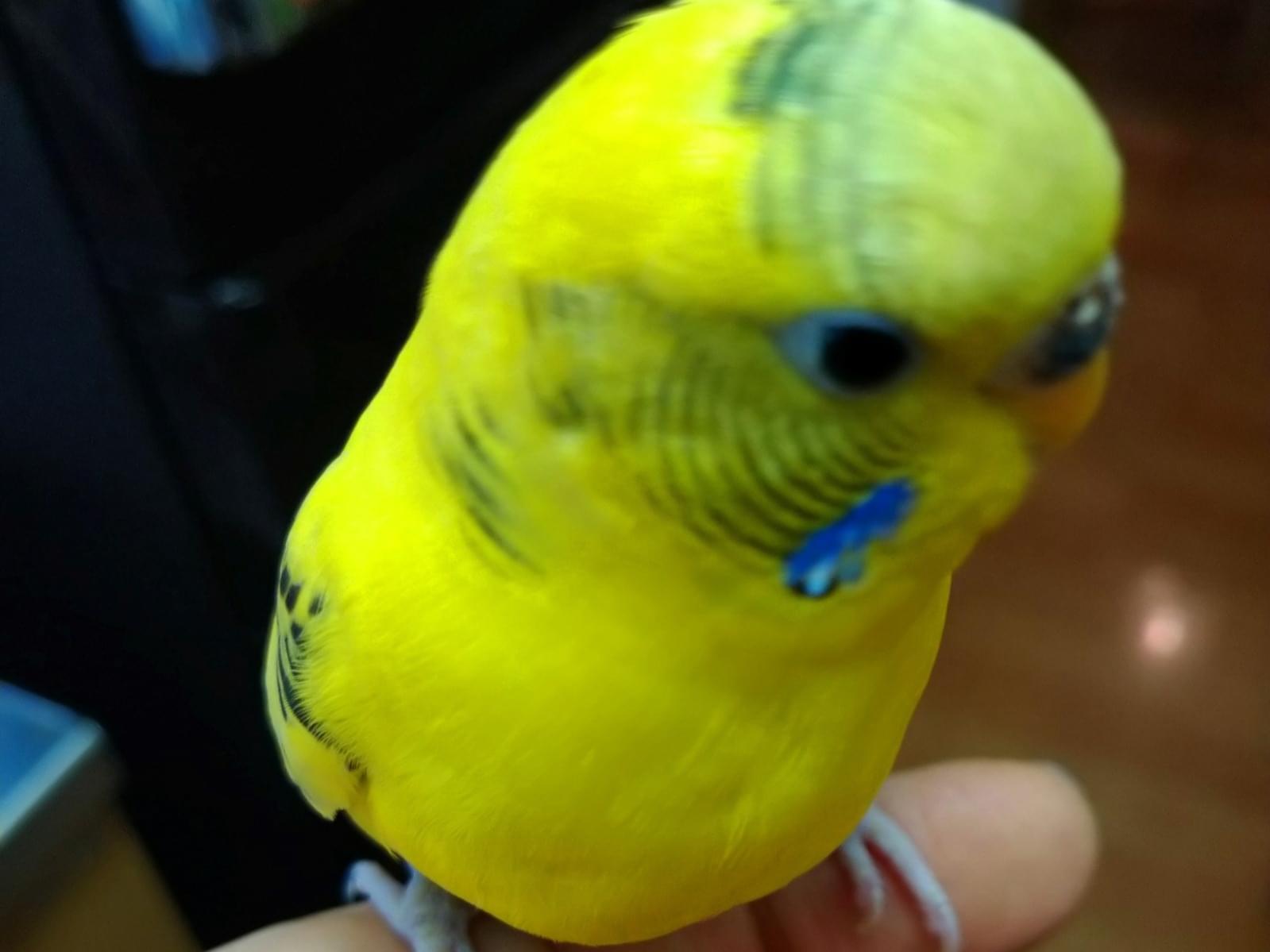 黄色いセキセイインコで、ひよこのように丸こい体型で、尾が長いです。