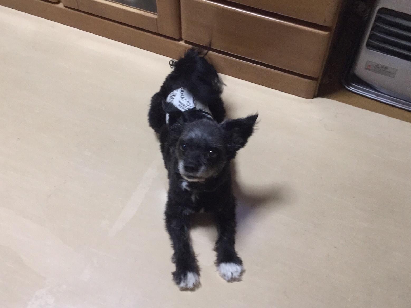 黒い犬ですが足の先と首周りは白い毛です。