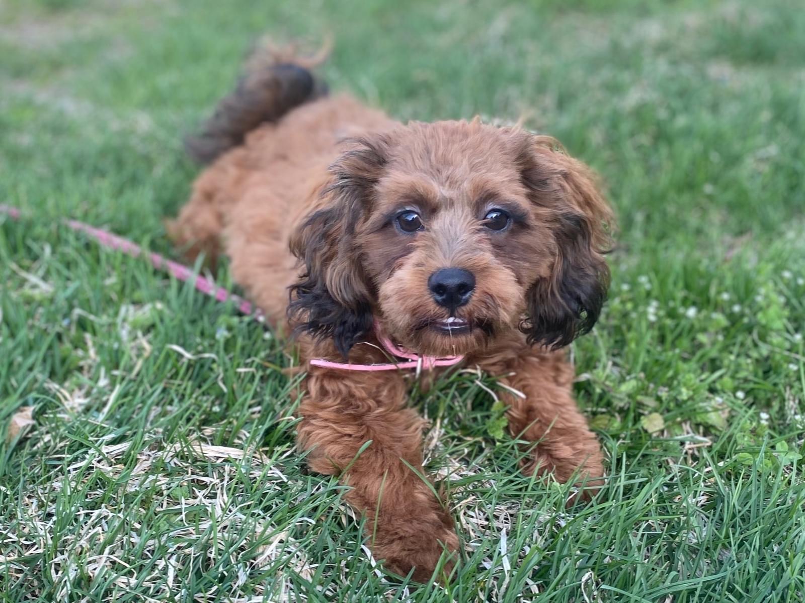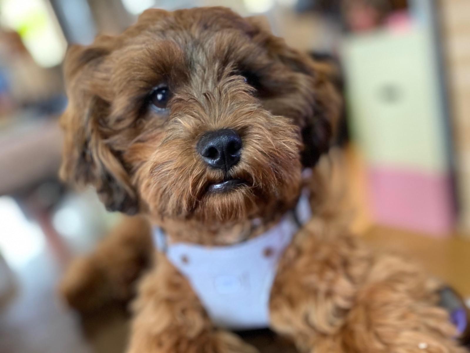 プードルとシーズーのミックスです。チェック柄の首輪に白いデニム生地のハーネスが付いています。