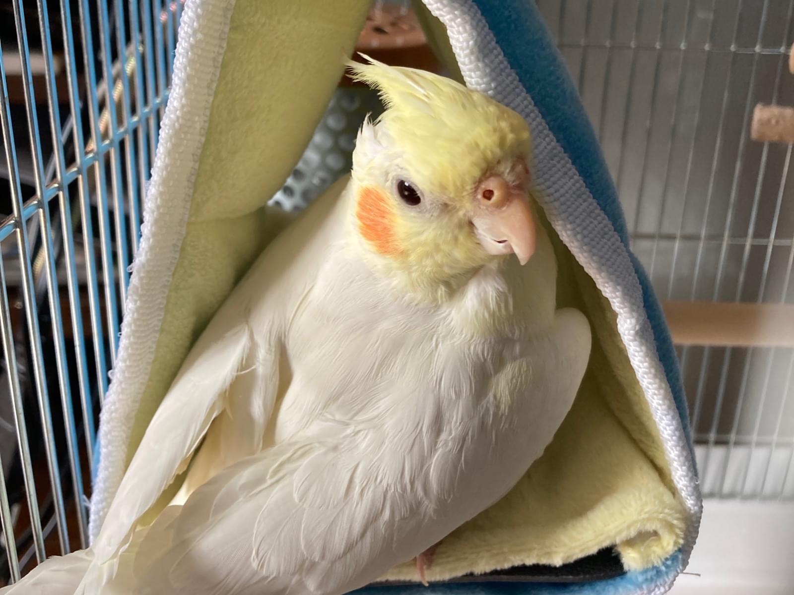 白にうっすら黄色、ほっぺが橙のオカメインコです。