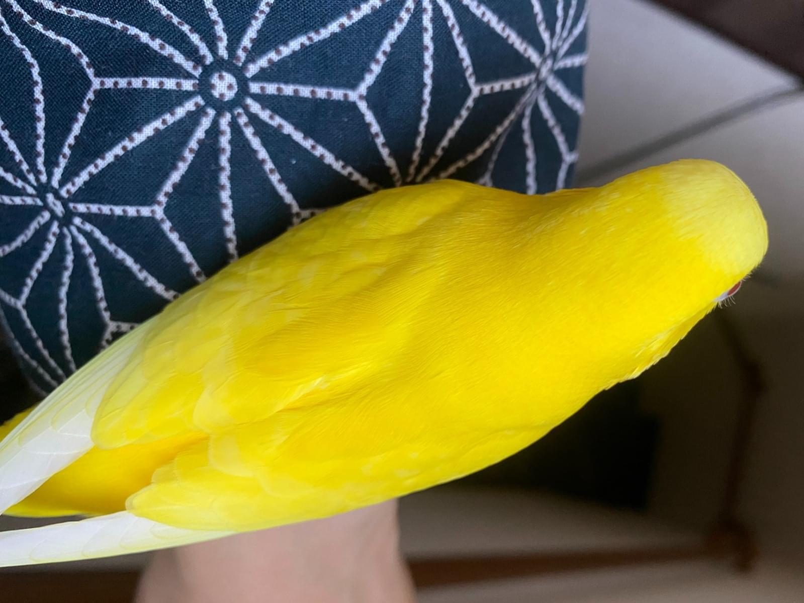 黄色いセキセイインコで目が赤いルチノーです。