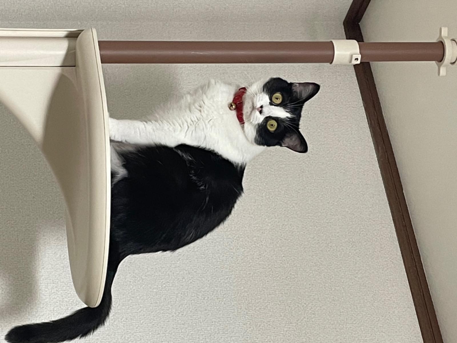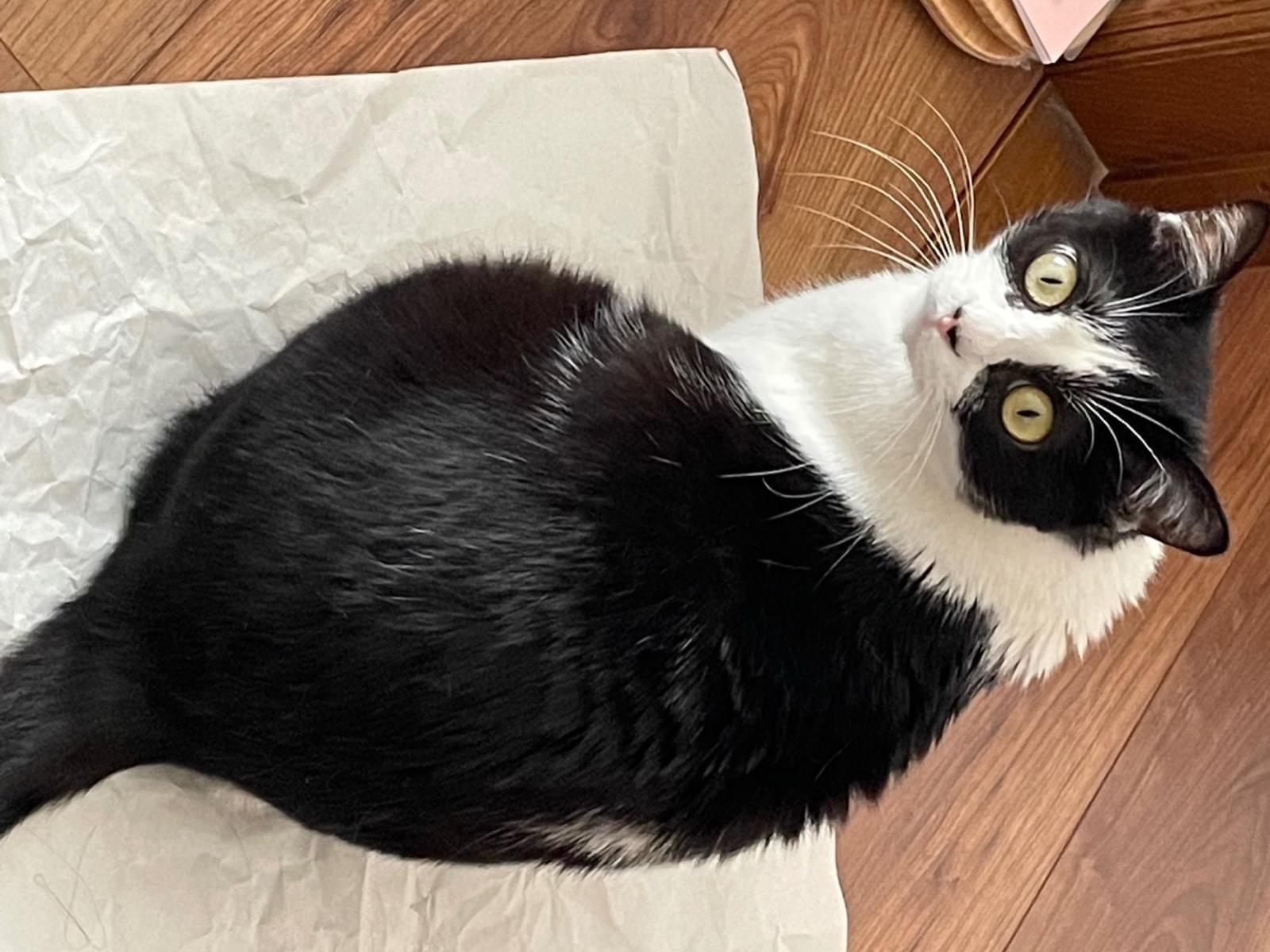 白黒ハチワレで、ピンク鼻に黒いポツポツ柄。