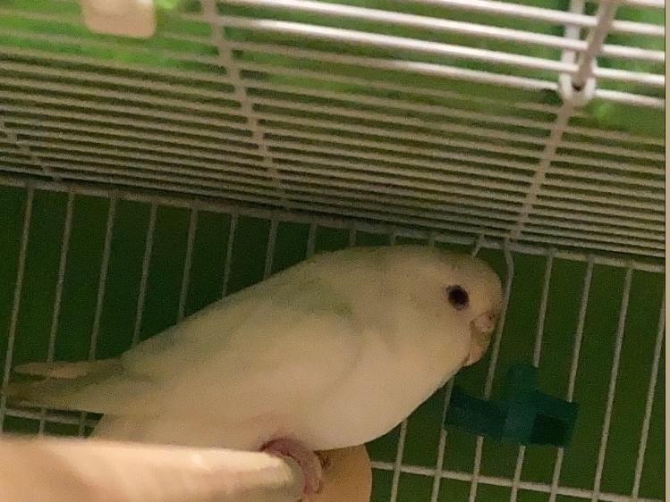 白くて目が大きいセキセイです。尾の辺りに青い模様があります。