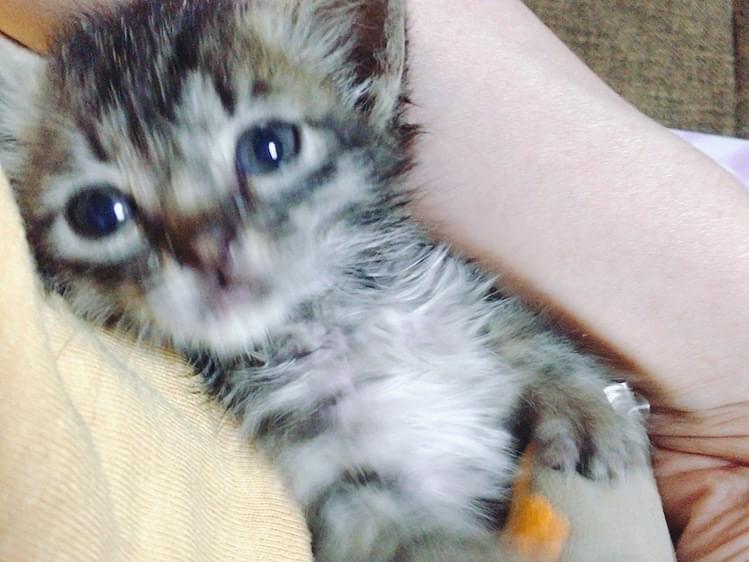 キジトラの女の子で350gで人懐こく、びーびーと怪獣のように泣きます