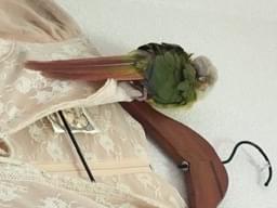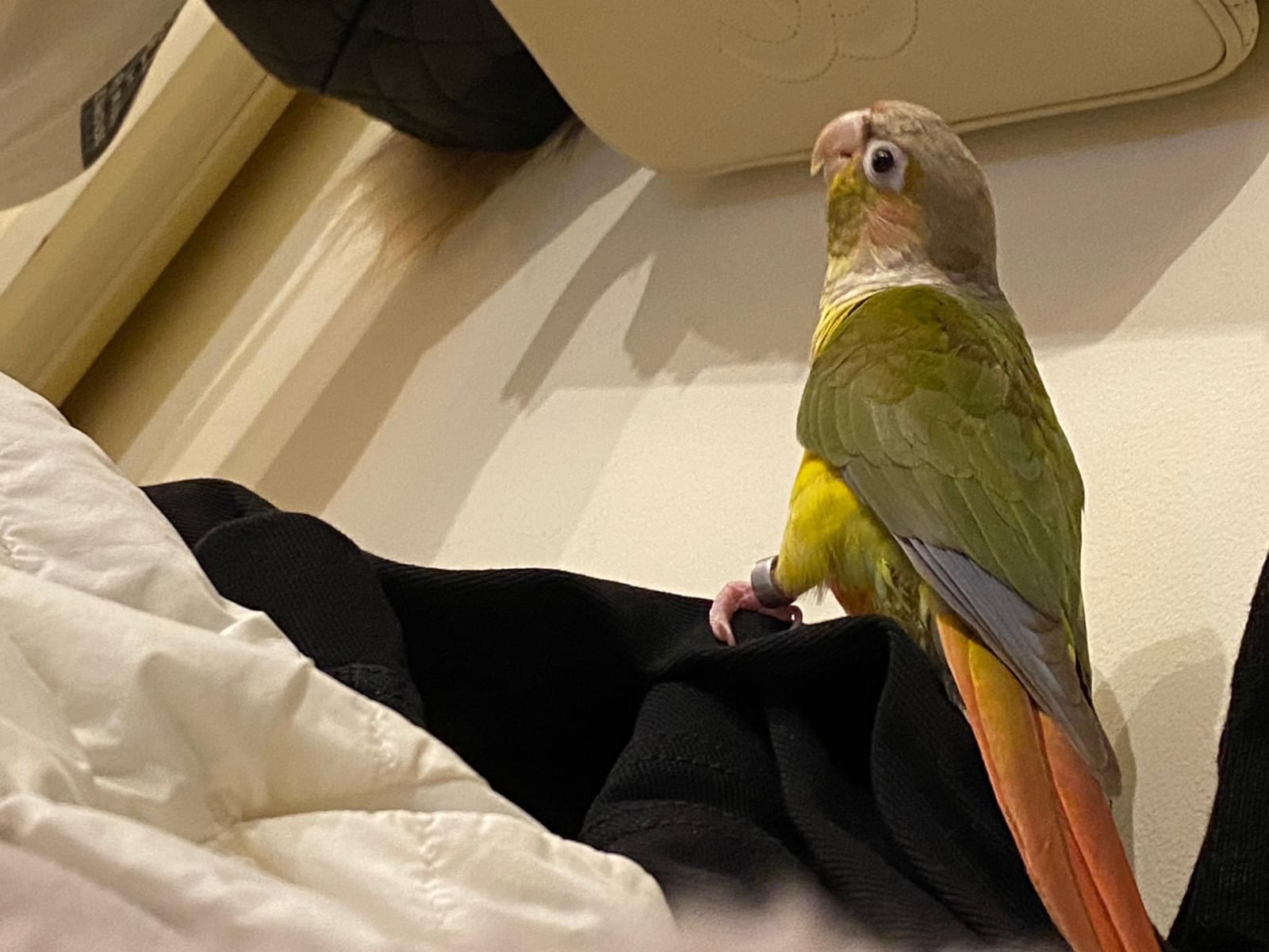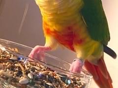 ウロコインコ(パイナップルとシナモンの中間色)、左の脚に銀の足輪つき。