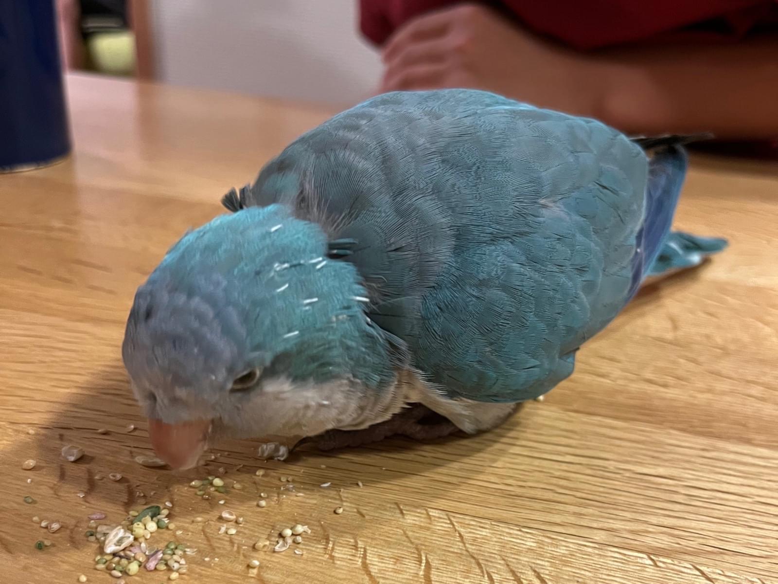 コバルトブルーのような色のオキナインコ(←調べました)です。首周りは鱗状でグレーです。