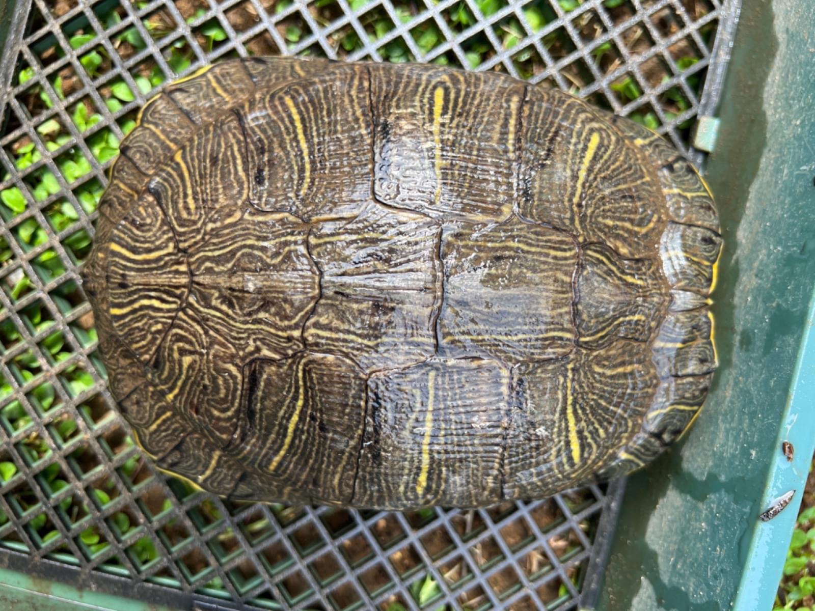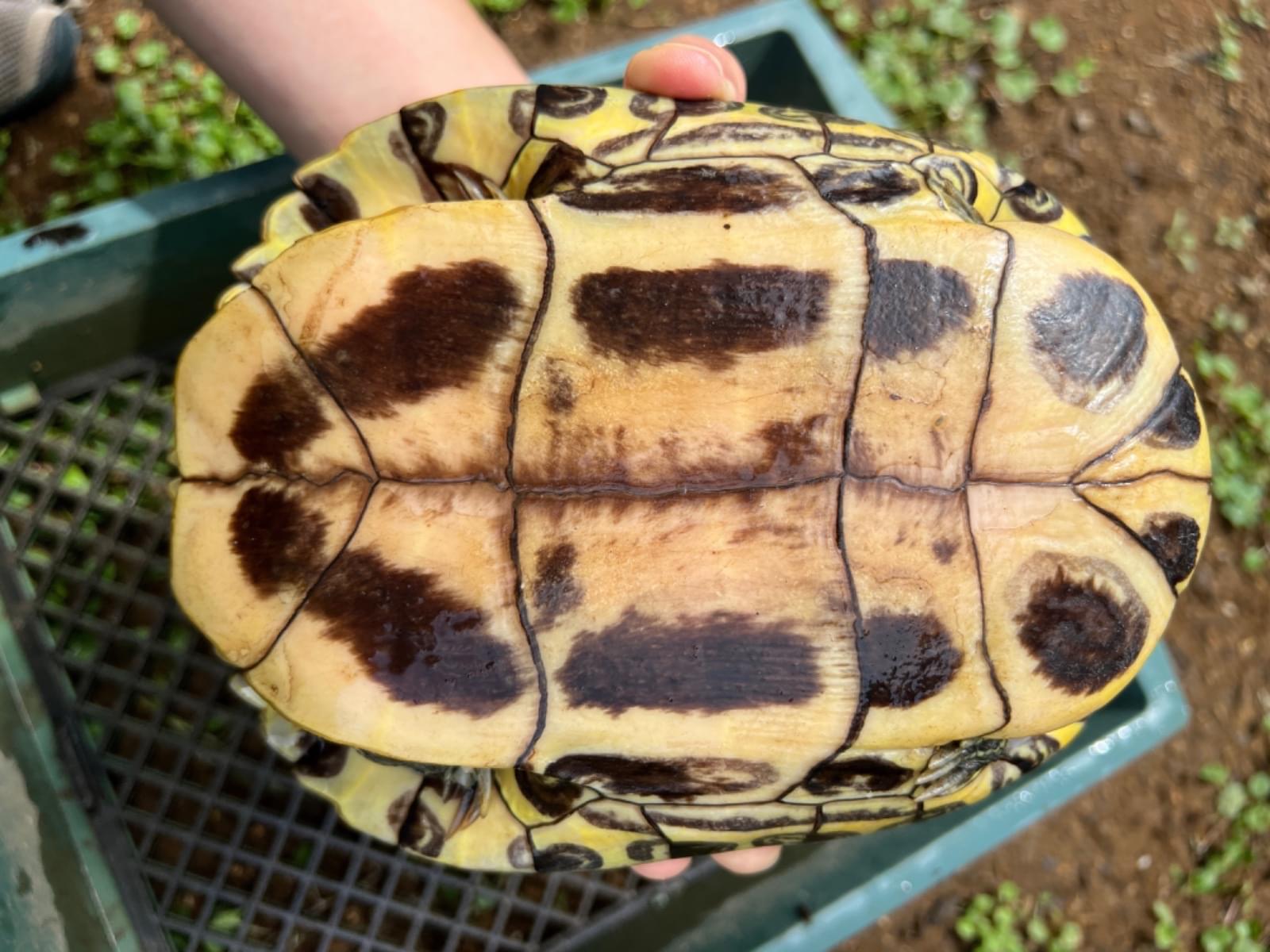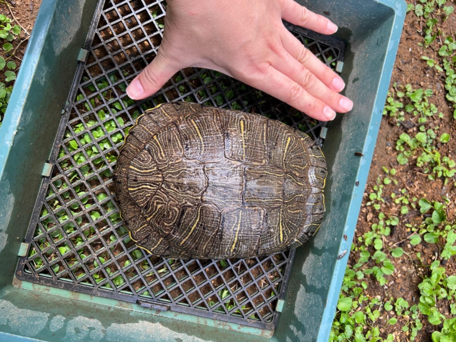 ミシシッピアカミミガメ甲長20cm位。北本市西口で保護しました。