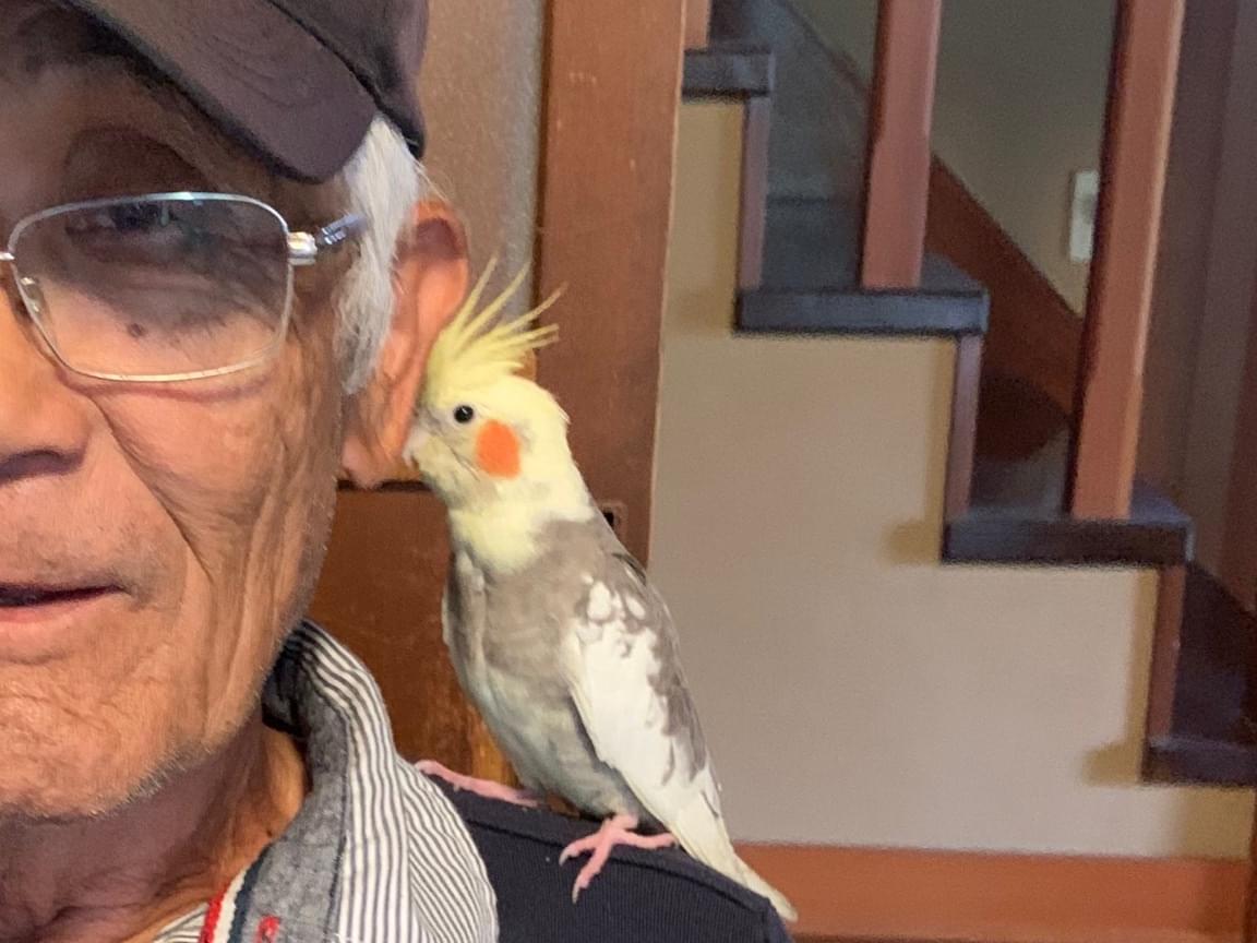 とても人懐っこい性格で、口笛のマネをして、可愛い子です。背中はグレーで白とまだらのような色です。ほっぺは赤く、冠と尻尾は黄色です。