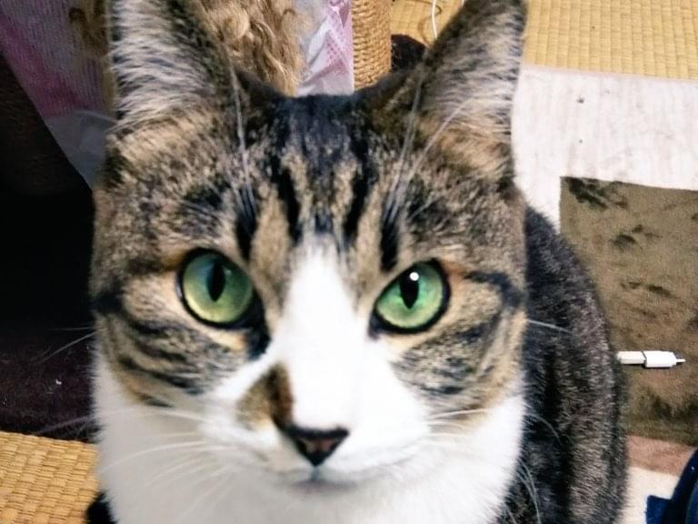 猫種はシロキジです。鼻の右に茶色の斑点あります。お腹と四肢が白くて、尻尾は長くて真っ直ぐ。瞳は緑。