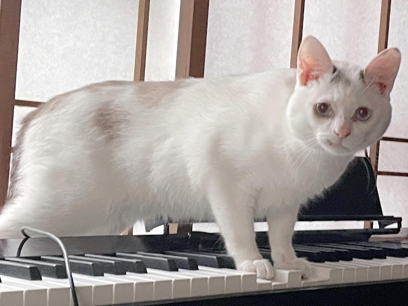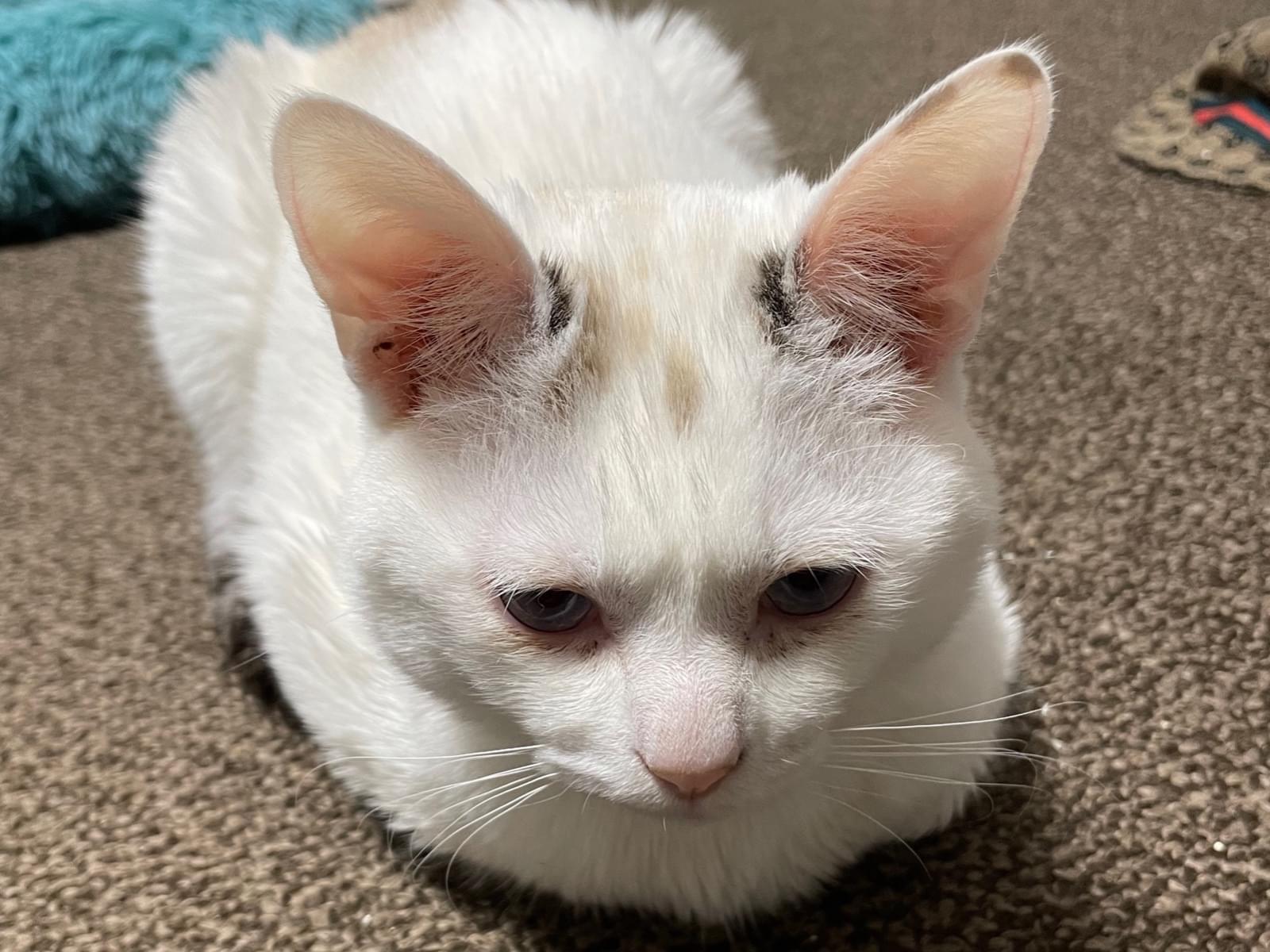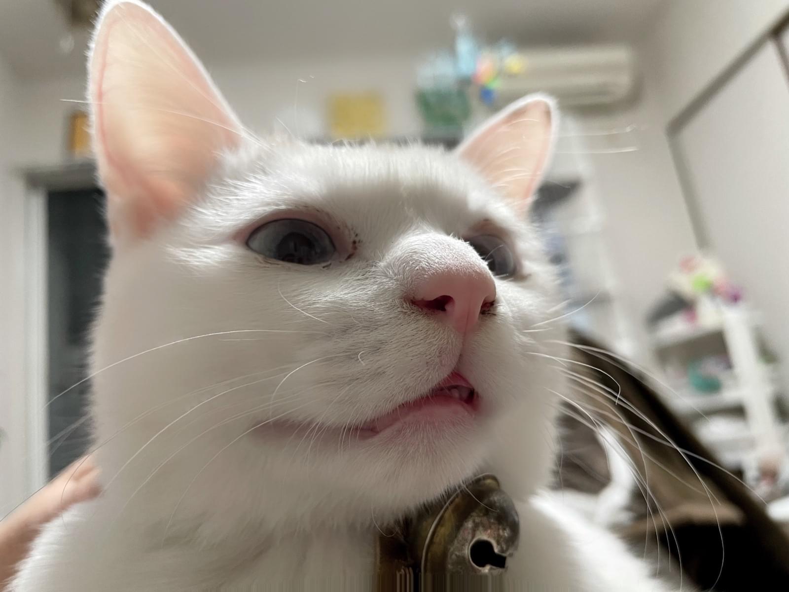 白猫、背中としっぽに柄があり、下の歯が口からはみ出ています。