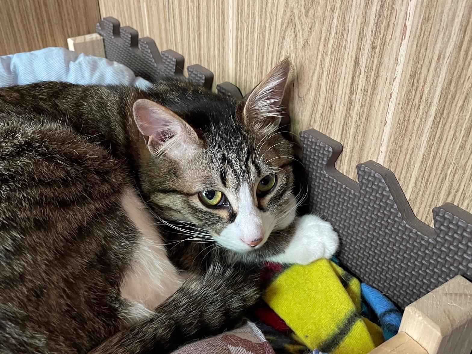 キジ白で、前足がキジ色で後ろ足が真っ白です。