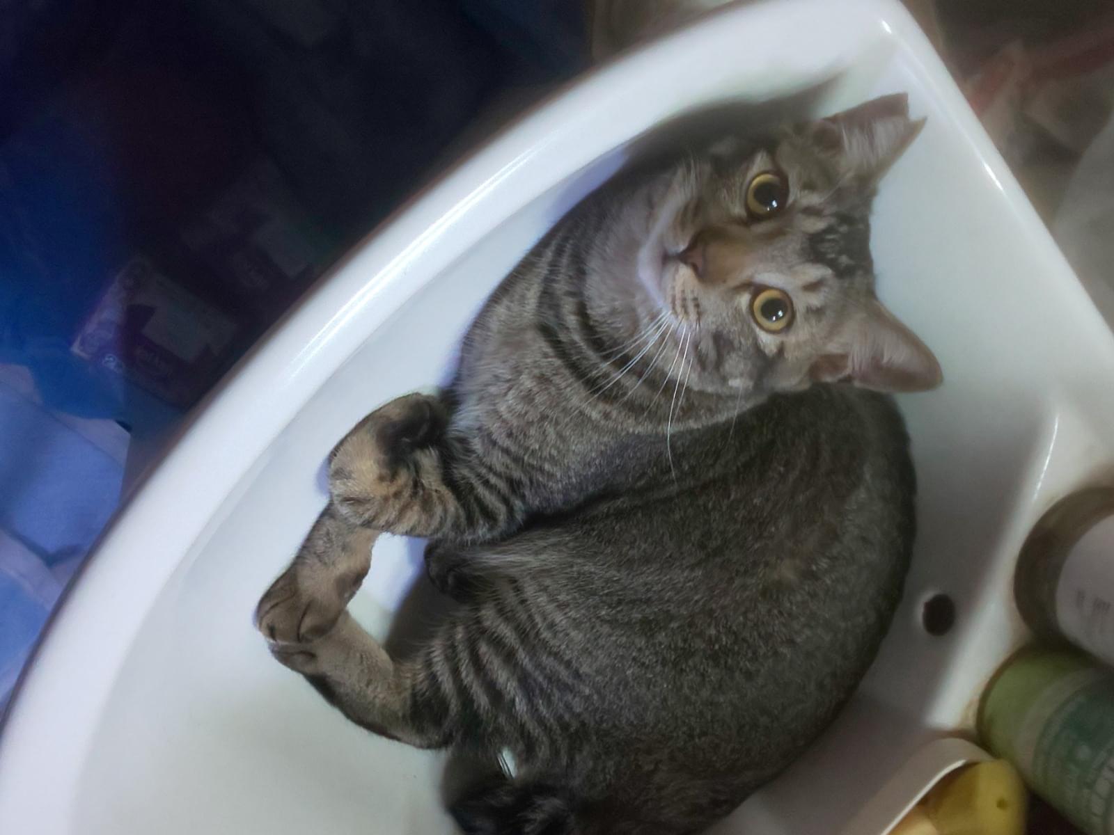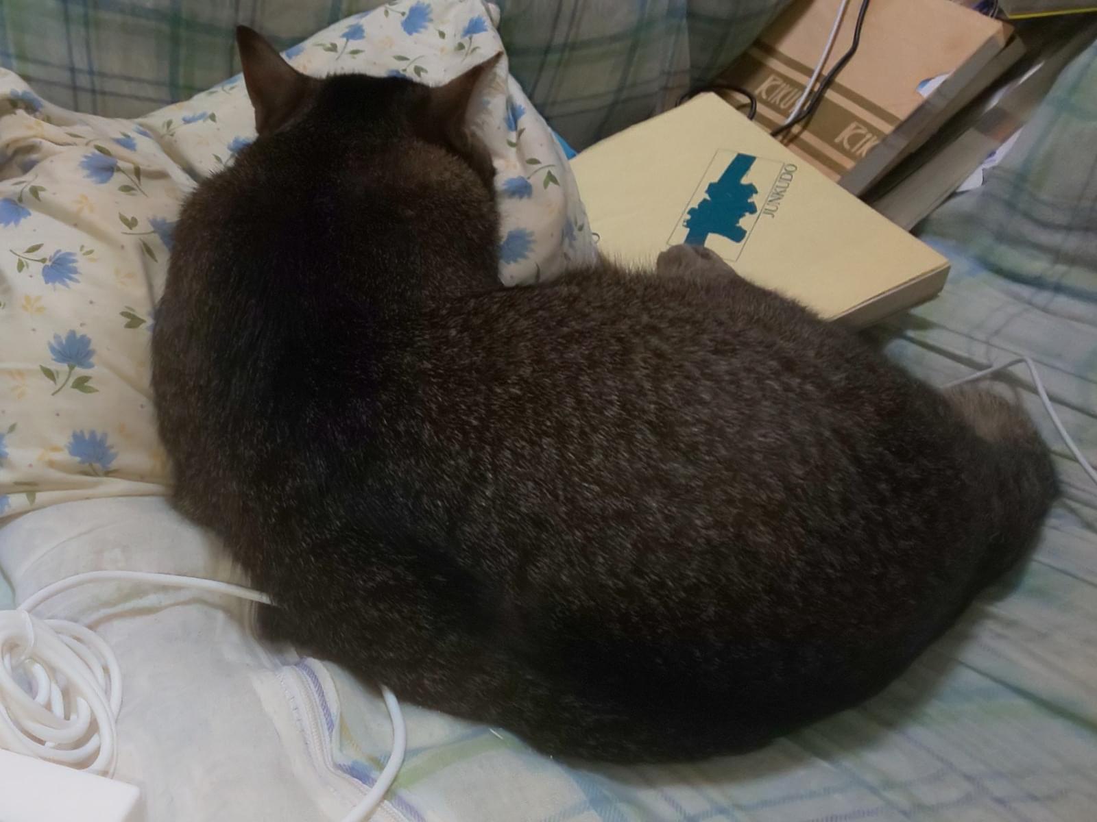 キジネコでアビシニアンの血が混じったような胴体にシマが無くシッポの先がクルリと団子ように丸い子です。