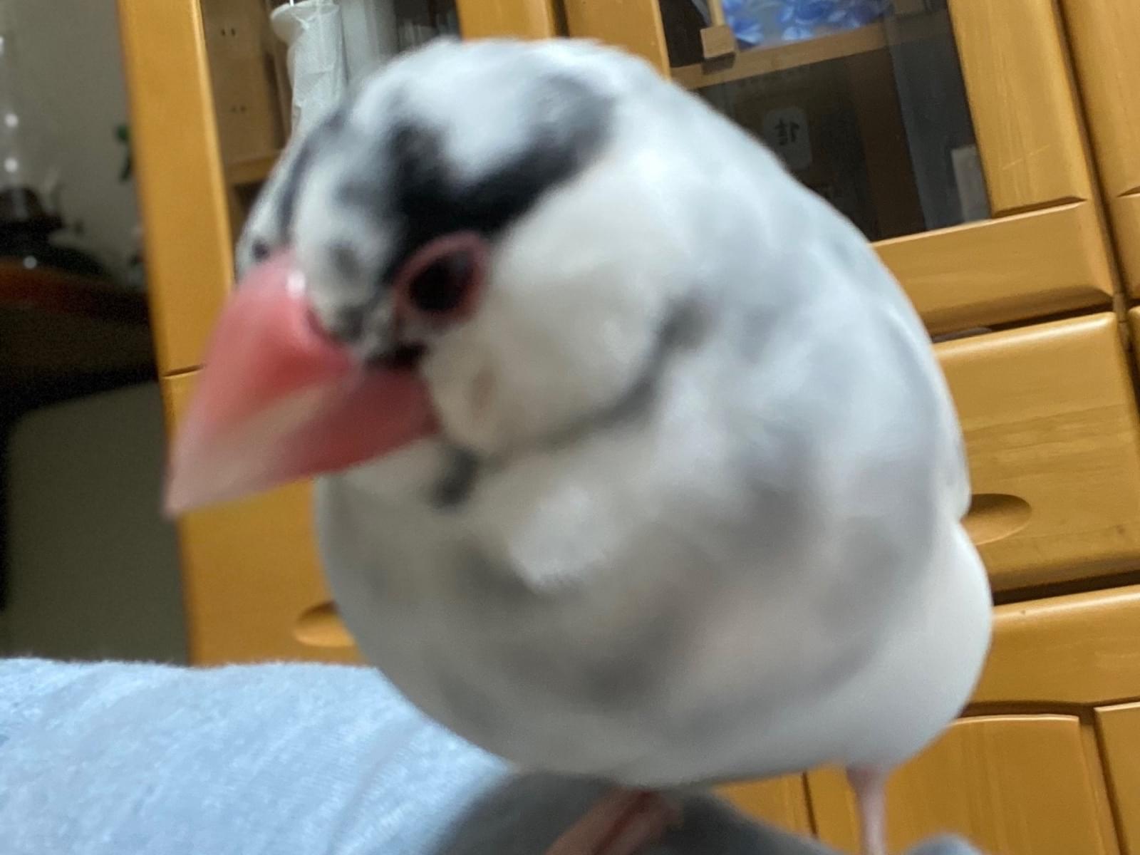 桜文鳥で、頭の黒い羽の半分が白くなってきています。背中も白い羽が多く、お腹の方は、真っ白です。