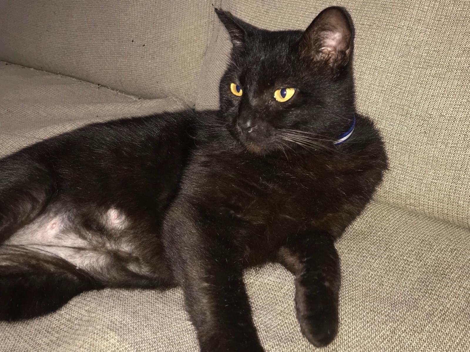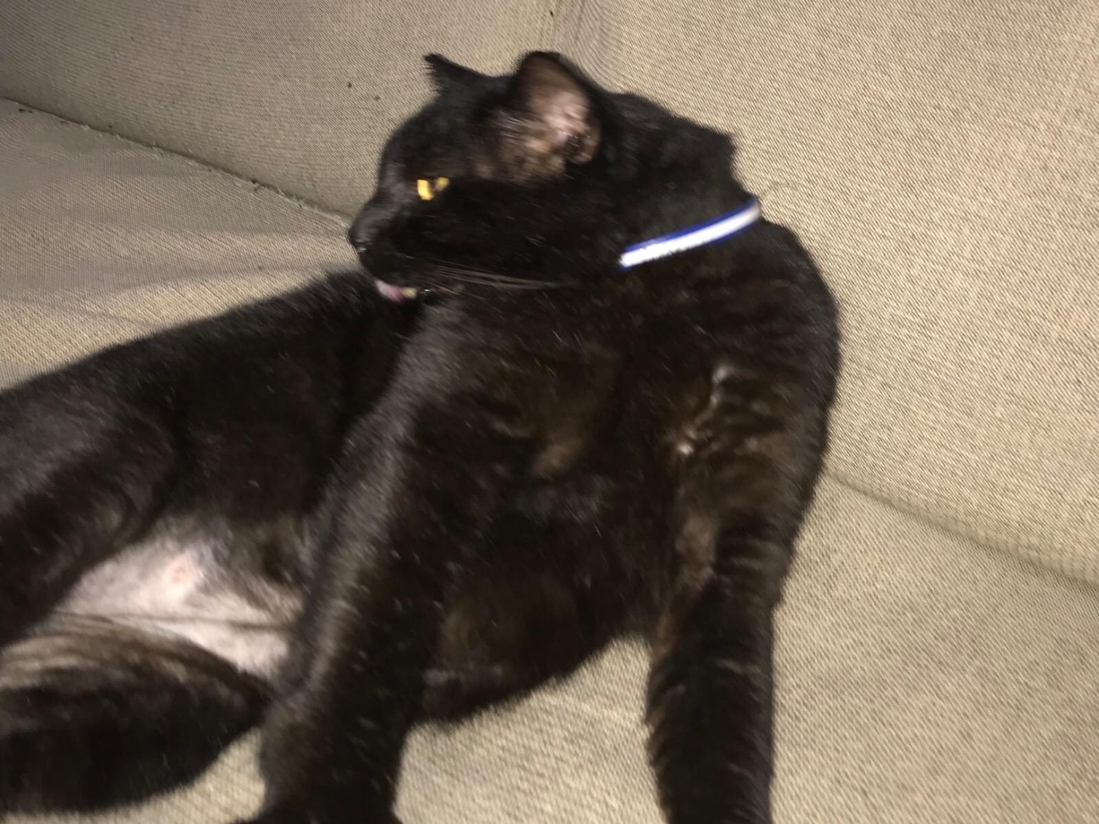 真っ黒のメス猫 首輪あり(白と紺色ストライプ鈴なし)を保護しています。